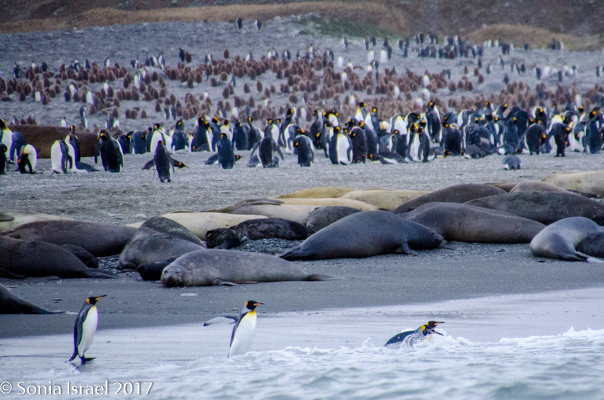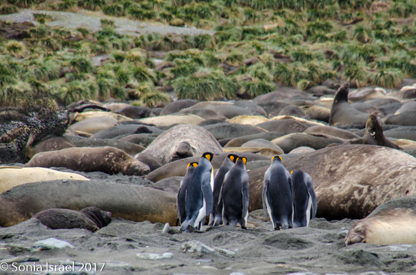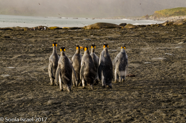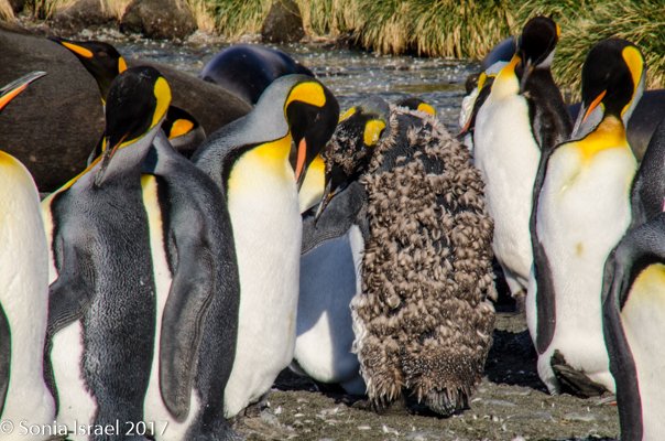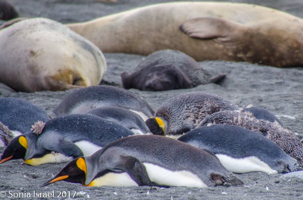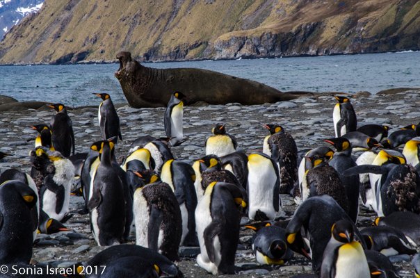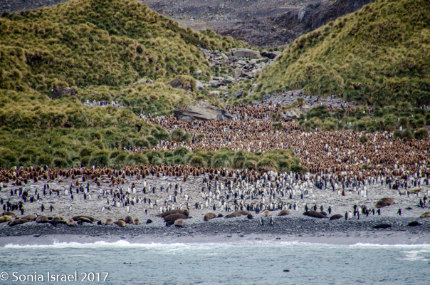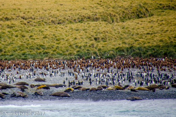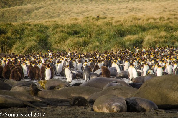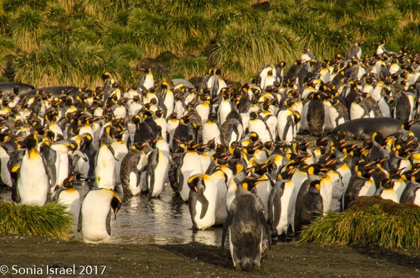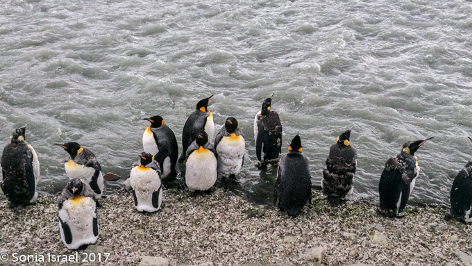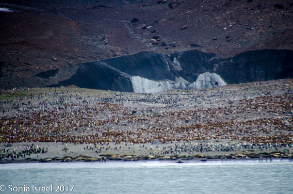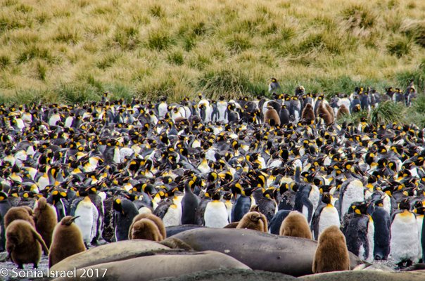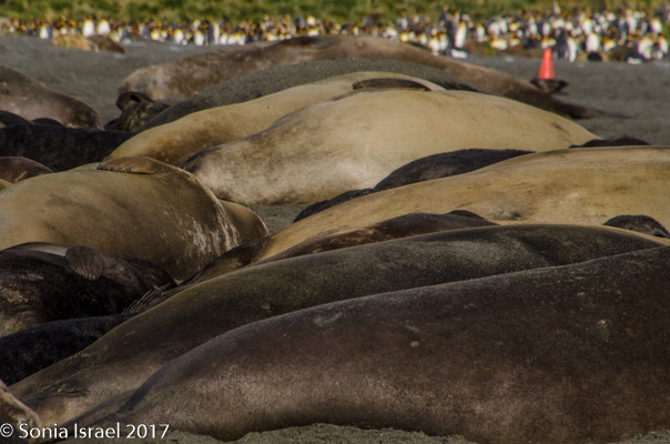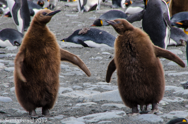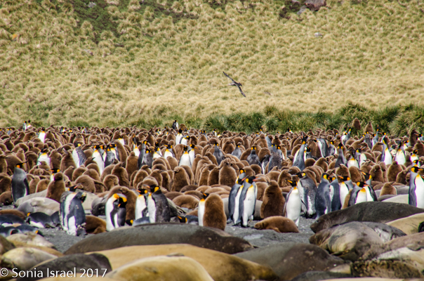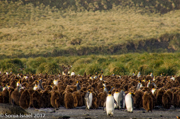 So, the beach was covered in elephant seals. And behind the elephant seals, were hundreds upon hundreds of King penguins, holding their heads up high. In the distance we could see all the Oakum boys bunched together in their creche, to keep warm, with a white and orange head sticking up here and there. Who are the Oakum boys? They are the fluffy, wooly brown King penguin chicks, all names given to them by the early explorers. They thought these fluffy penguins were a whole different species and named them after the brown tar they used to fix their vessels.