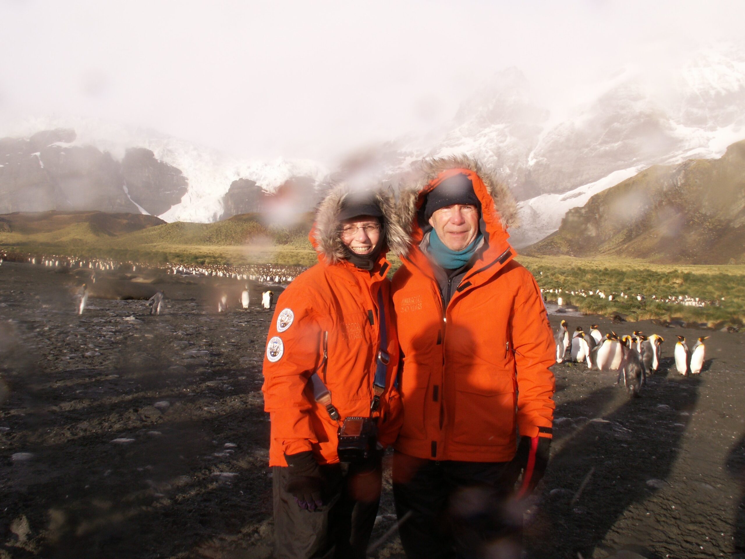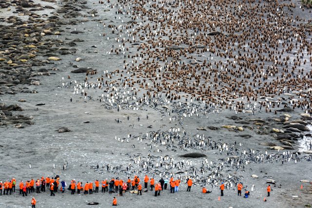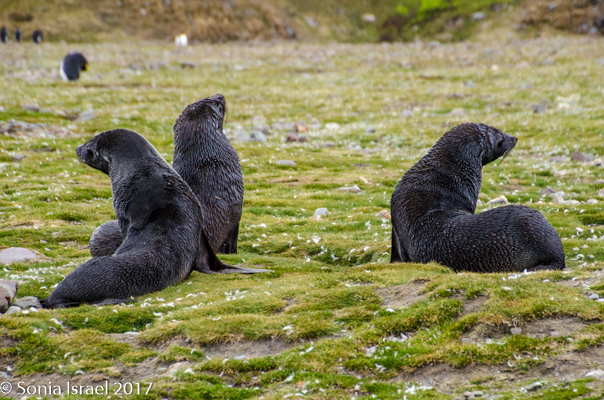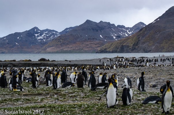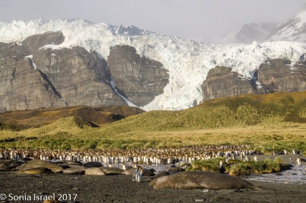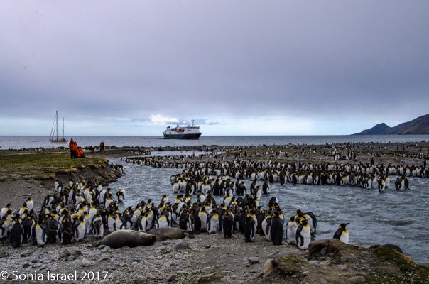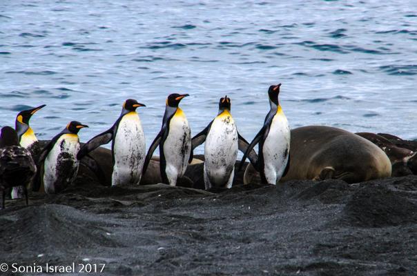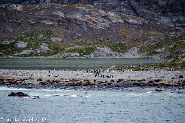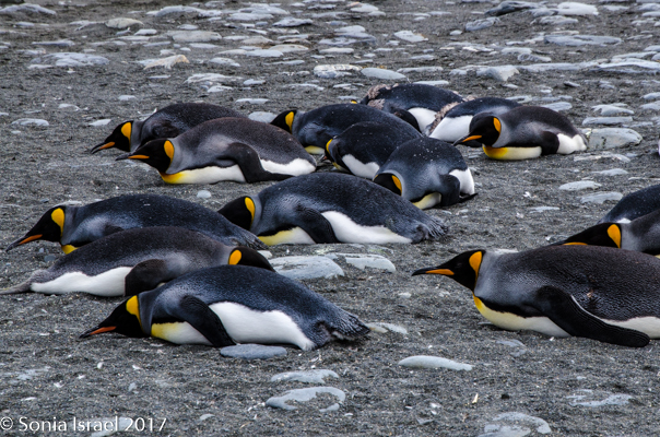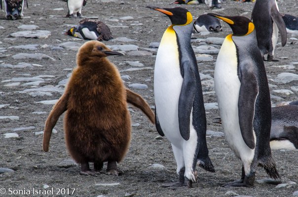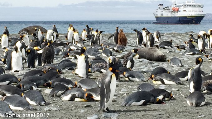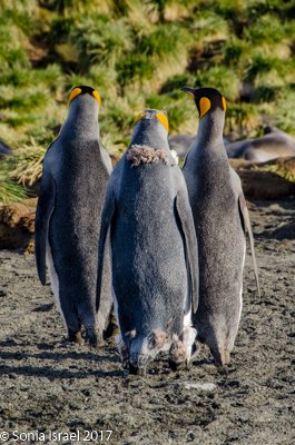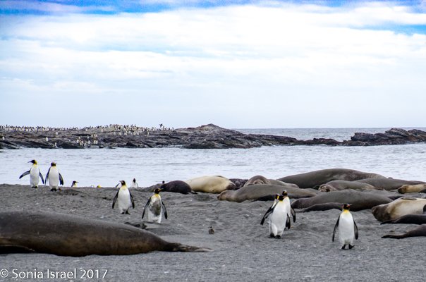 So, the beach was covered in elephant seals. And behind the elephant seals, were hundreds upon hundreds of King penguins, holding their heads up high. In the distance we could see all the Oakum boys bunched together in their creche, to keep warm, with a white and orange head sticking up here and there. Who are the Oakum boys? They are the fluffy, wooly brown King penguin chicks, all names given to them by the early explorers. They thought these fluffy penguins were a whole different species and named them after the brown tar they used to fix their vessels.