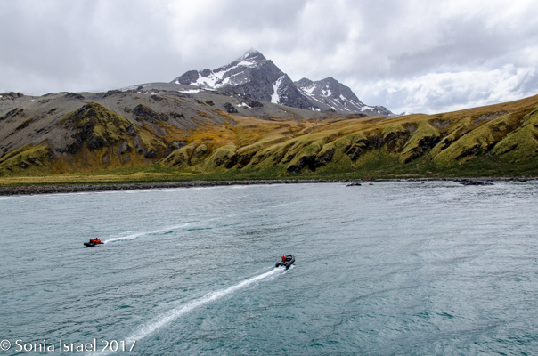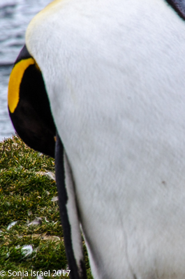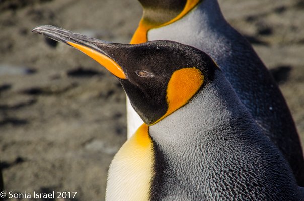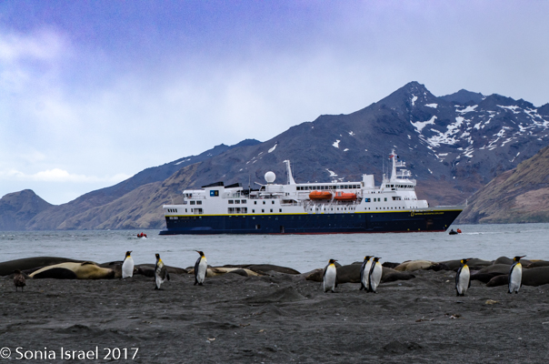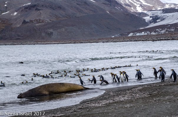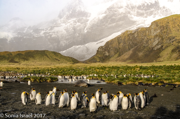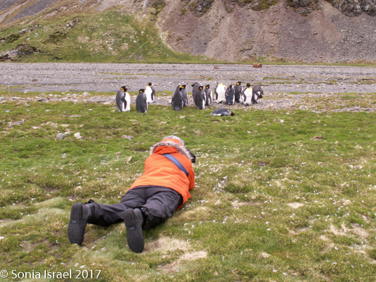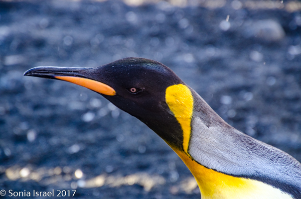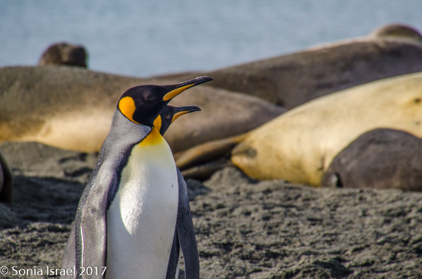 Landing on the beach was difficult because of the hormonal male elephant seals. You don’t want to get in the way of an angry elephant seal, and any male protecting his haram is going to be aggressive. The zodiac pulled close to the beach and there was an elephant seal sitting in the water right next to us. We carefully disembarked on the other side when suddenly he decided to come around the front of the zodiac and swim away. Whew!  We carefully swung our legs over the side of the zodiac, stepped into the water and onto the beach, where we discarded our life vests. We carefully walked along the beach, around all the elephant seals, giving them a wide berth. We probably looked like a line of orange penguins as we made are way to the edge of the actual King penguin groups. The sun was just rising behind us and the light was magnificent. The feathers on the penguins glistened, their eyes sparkled, and the shadows were long – both ours and theirs. Every once in a while, we would hear the male elephant seal bellow and we would move out of the way as it shimmied, like a worm – a very large worm – across the sand. The penguins sounded like a trumpet. The elephant seals sounded like a car engine revving up. The wind was blowing. It was all very loud. And yet calming, as it was the sounds of nature. (Listen to the video…)
