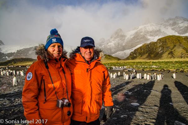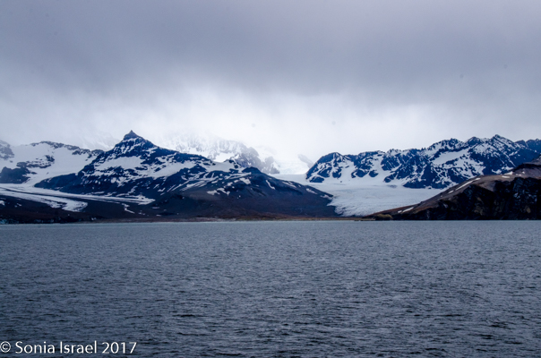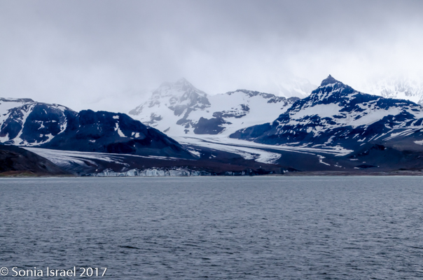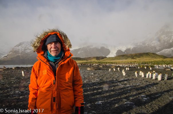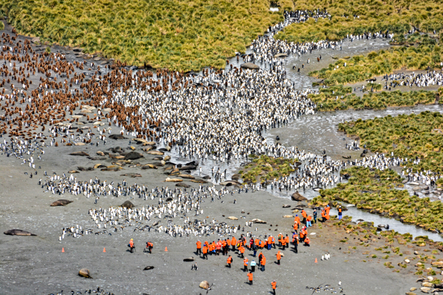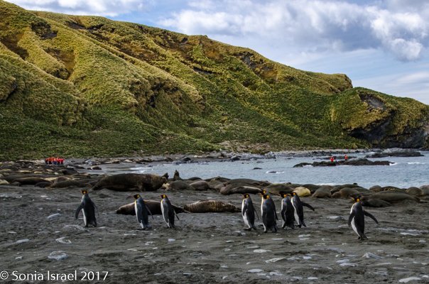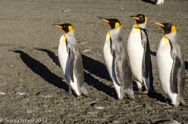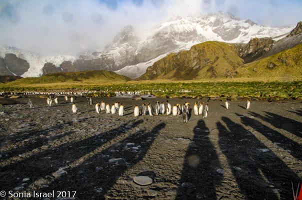 We stood or sat in the grey sand for over an hour, just taking in the sights of the black and white and orange penguins standing against the green tussock grass below the white glaciers. Or marching in groups, but one behind the other, like a school band. And the shadows were as spectacular as the penguins themselves. There were our shadows and their shadows. Colors and sounds. Sounds and colors. Oh yes, and smells. The smell of the penguins, which when the wind was blowing in the right direction, reached all the way to the ship.