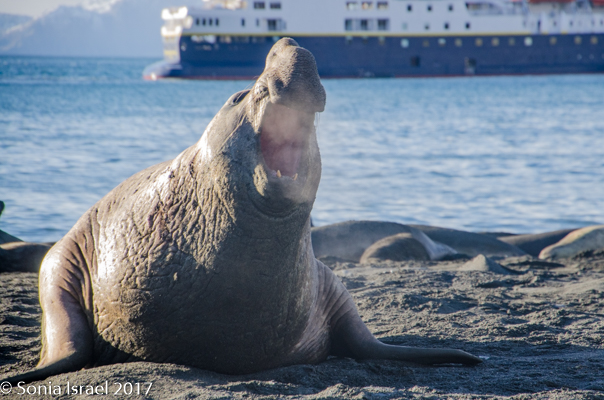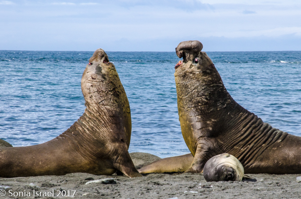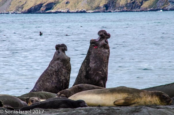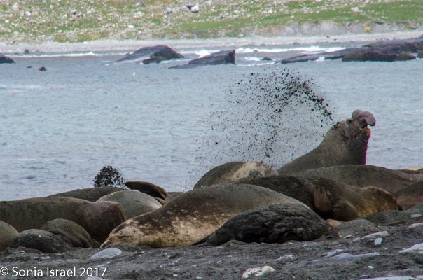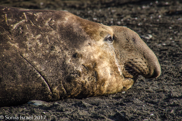 There were a few penguins making their way out of the water, hopping onto land and more just swimming about. The beach was once again a carpet of elephant seals, each suddenly displaying a burst of energy when another male approached, and aggressively undulating their way across the sand. And when thousands of pounds are coming towards you, better get out of the way. The funny part is that they move quickly for a few seconds, and then collapse down in what seems like exhaustion from all that effort.