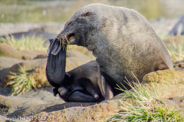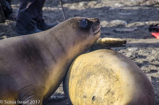 A harem can be anywhere from 2-50 females, although we saw one that was almost 100 female seals. The females come onto land in October, give birth right away and nurse for 23 days–1 month.  The females all try to be closest to the alpha male, so the younger females end up on the outskirts of the harem. About 4-5 days before they wean their pups, they go into estrus. They then mate with the males, and gestation is 9 months. But here is the interesting part. They employ delayed implantation which means the embryo is “frozen” for the first 3 months while the females return to sea to fill their bellies with squid and become strong and healthy again.