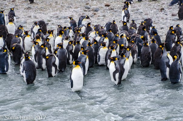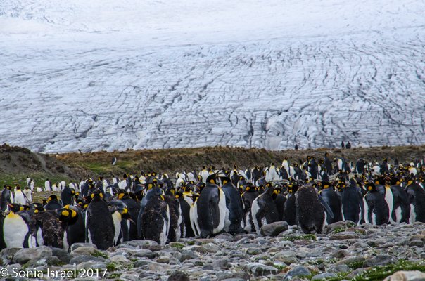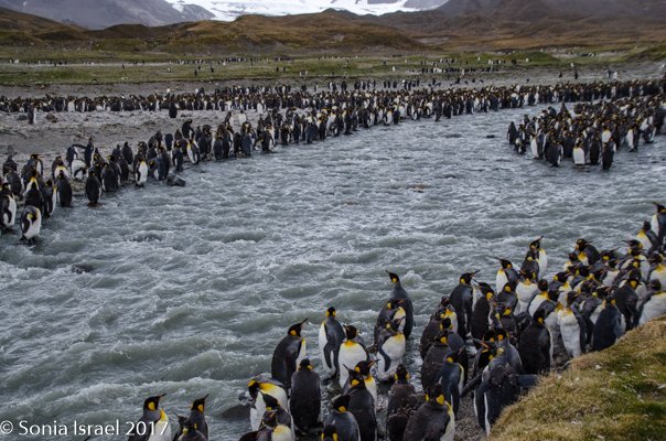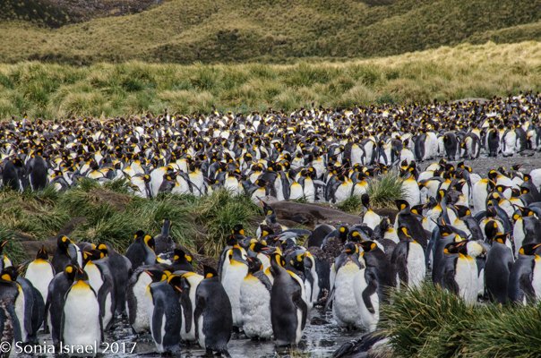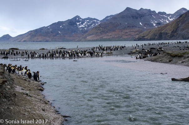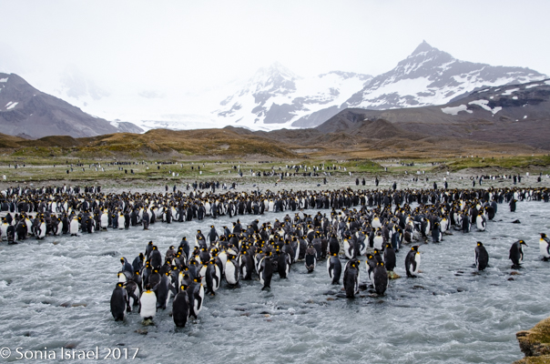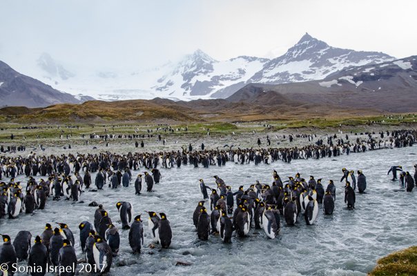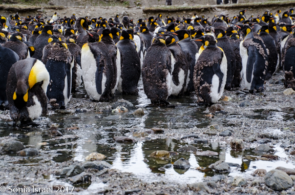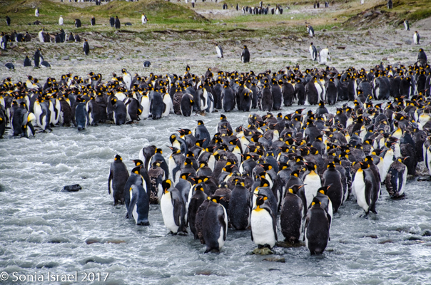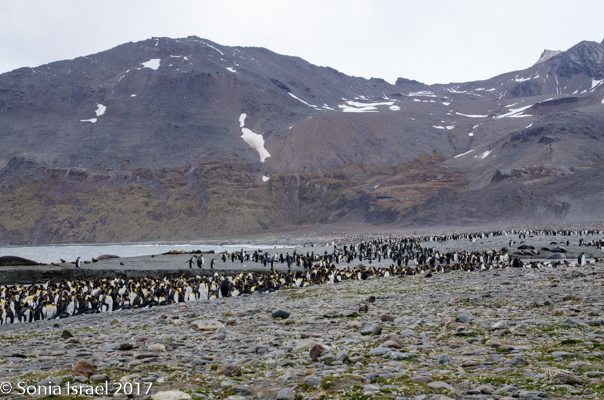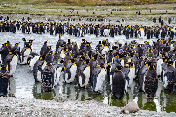 We found a path and made our way around the seals towards the large colonies of penguins. And I mean large. It is estimated that there are between 200,000 and 500,000 pairs of King penguins here at St. Andrews. There was a raging river (well, maybe a raging stream coming off of Heaney Glacier) and the penguins created islands within the water. Some were lined up along the shore. Others were standing in groups in the middle of the water. Many were molting. They looked like they had fur vests on. They molt for about 4-5 weeks right before breeding.