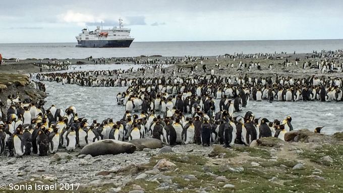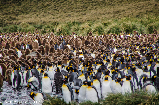 It is hard to put into words the magnificence of seeing hundreds of thousands King penguins all in one place. Really as far as the eye can see. There was a sea of black and white with orange spots. The Kings look like they are wearing a black and orange hood. And in the midst of the black and white, was a cluster, a crèche, of brown feathering birds, that is, the penguin chicks. Although I have not yet been to Africa, it felt like a migration of penguins. In fact, it is called the Serengeti of the Southern Ocean.