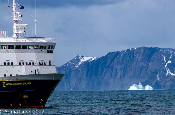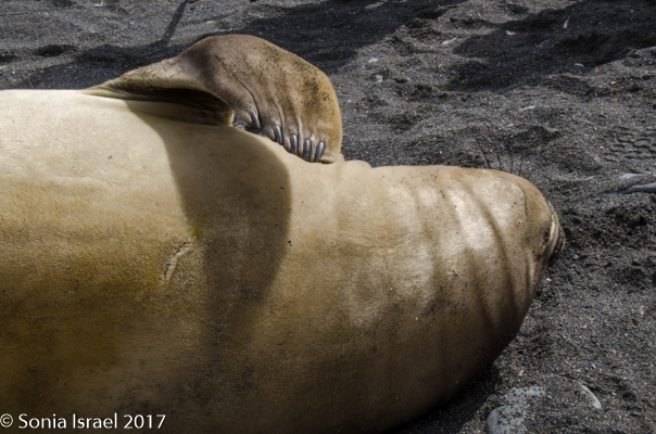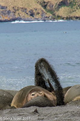 We took the zodiac back to the ship and much to our surprise, it was only 730am. Seemed like we had been out there the whole day. We had breakfast, then went back to the beach for a few more hours. At this point of the morning, the penguins were primarily lying down to cool off. (It was warm. Warm enough for me to take off my gloves and hat). They were more lethargic than they had been early in the morning. Some of the elephant seals were lethargic too, throwing sand on themselves to cool off.