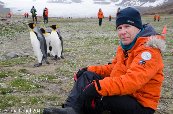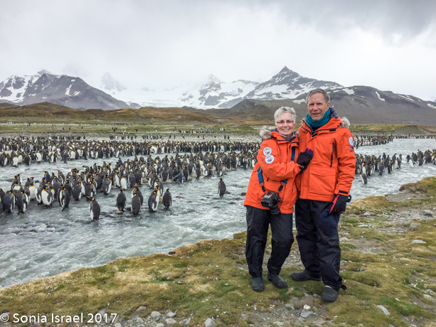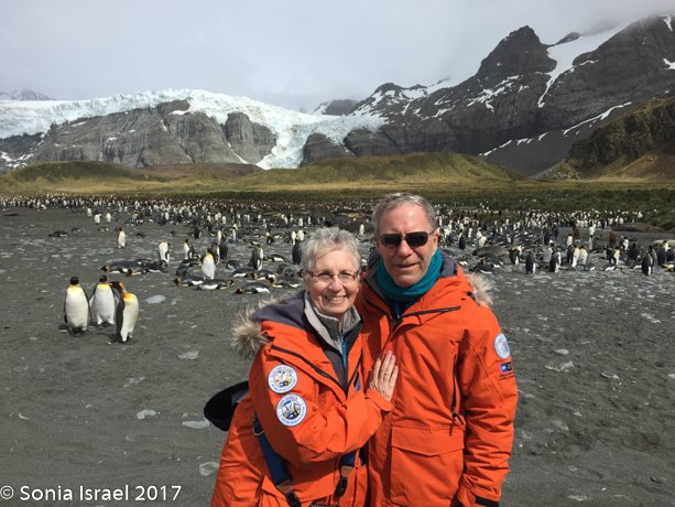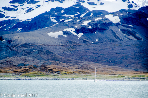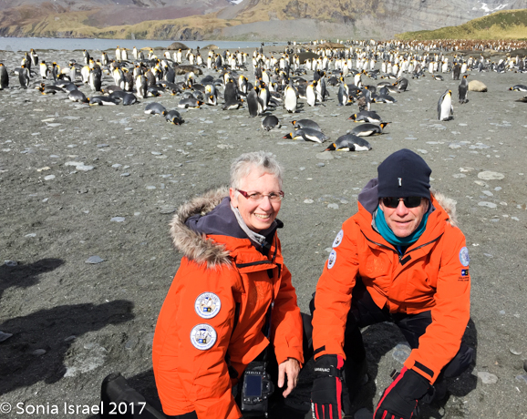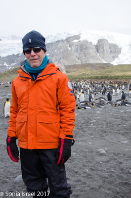 That afternoon we sailed into St. Andrews Cove and found a sailboat there with a film crew from Frozen Planet.  The cove was surrounded by glaciers, the beach covered with Elephant seals and the slight hill behind the beach covered in wall-to-wall King penguins. Doug made a reconnaissance trip to see where we could land. We all waited patiently. Andy and I went up to the bridge to watch as we weighed anchor, amazed at how many thousands of penguins we could see.