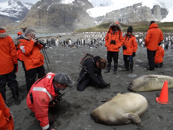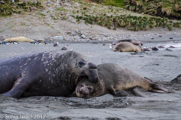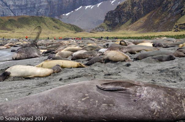 As the zodiac made its approach to land all we could see was a blanket of elephant seals. Big alpha males. Big beta males and lots and lots of females. This is a good point to talk some more about the elephant seals. People think about penguins when they think about South Georgia. And of course, there are hundreds of thousands of King penguins here. But there are also thousands of elephant seals, and you almost always seem to find the Kings and the Elephant seals together. Elephant seals, also called sea elephants, are named for their trunk-like nose, which only develops when they are about 8 years old. The males can be 14 feet long and weigh over 4000 pounds! The females grow to be 9 feet long and 1320 pounds. So, basically, they are the largest pinnipeds. When I said they were big, I meant it! The pups are born at 100 pounds.