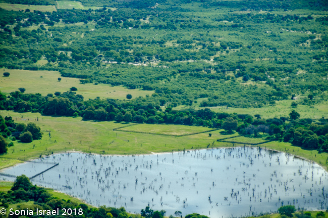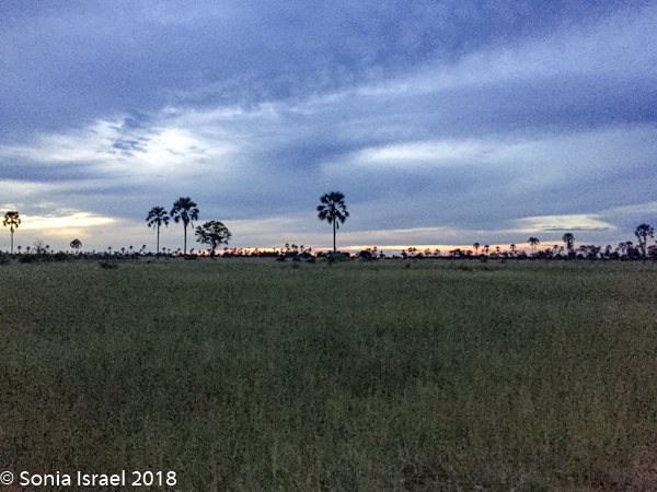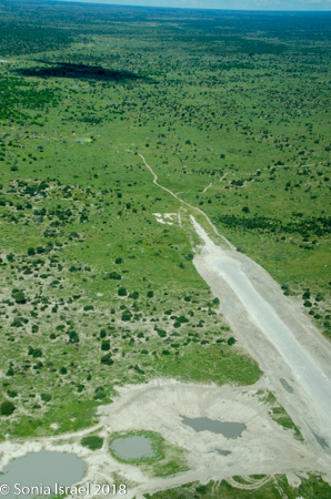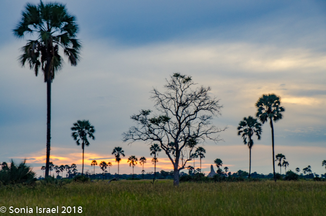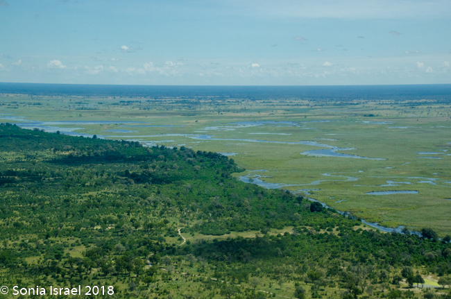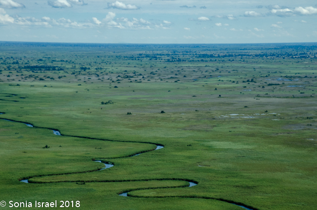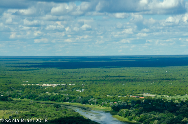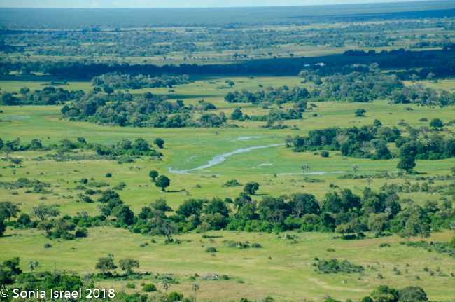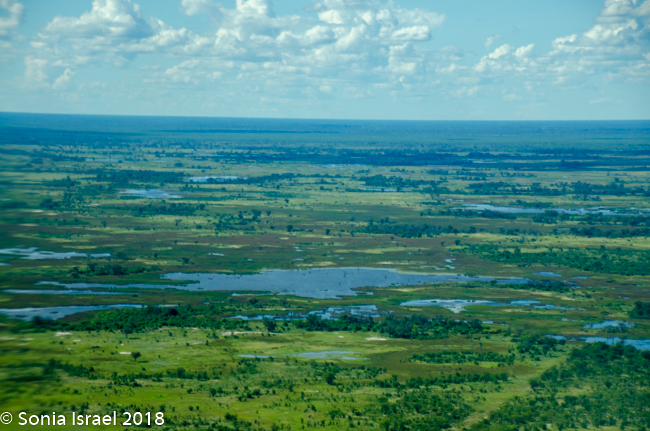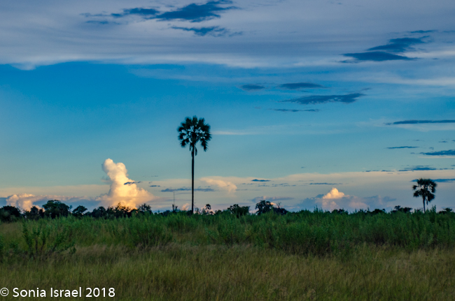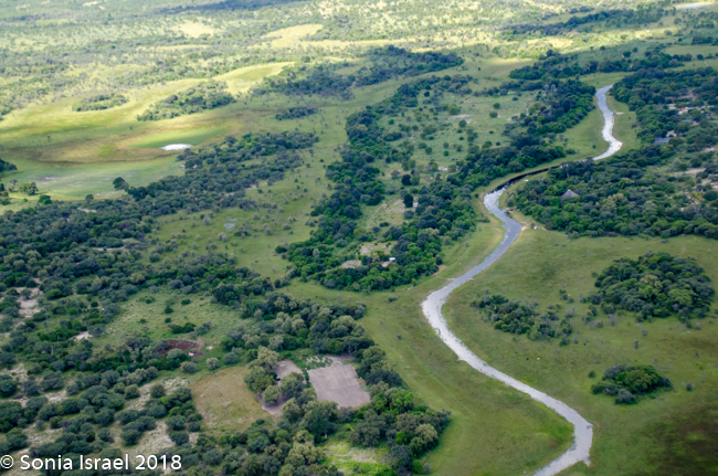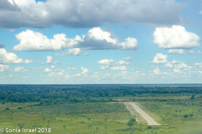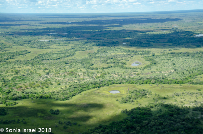 From the sky, the terrain was different shades of green, with wet areas of blue pools reflecting the sky and the clouds or ribbons of river running through the green landscape. Even the very green areas looked like they were wet, as if you stepped on them, you would fall right in. The pools looked like large spiders with legs coming out of the body. There were clumps of trees and separate clumps of palm trees. And there were huge towers which turned out to be termite mounds.