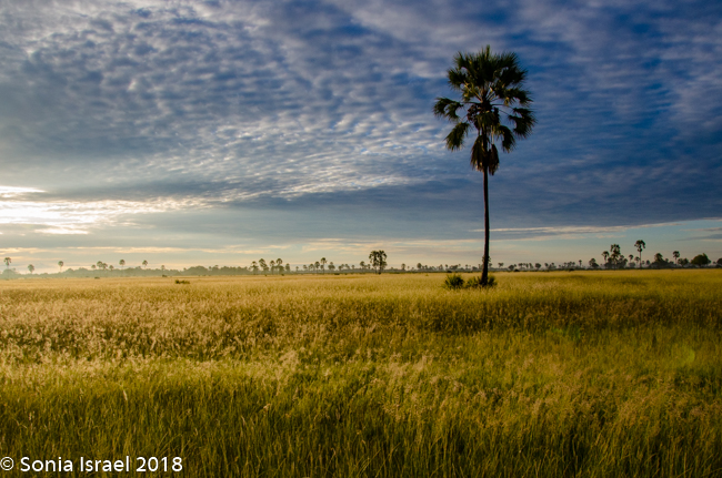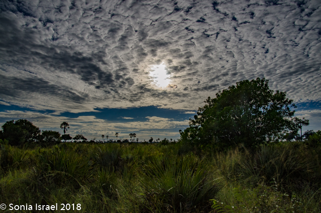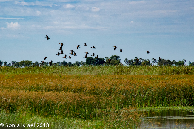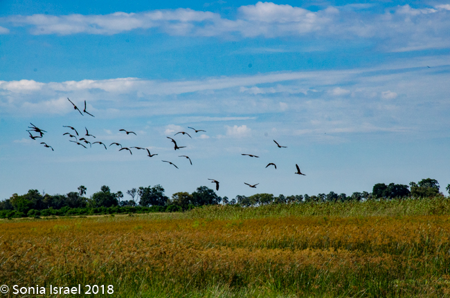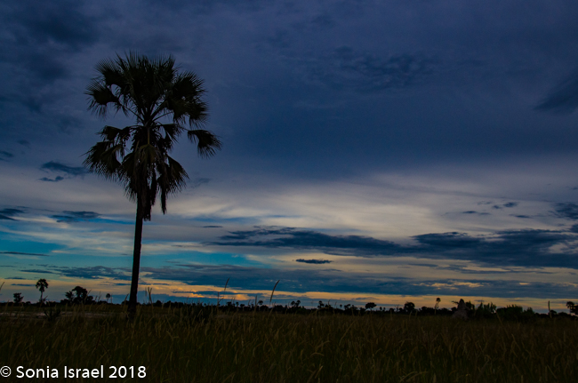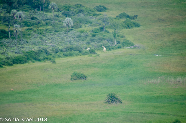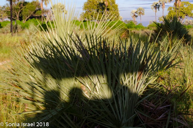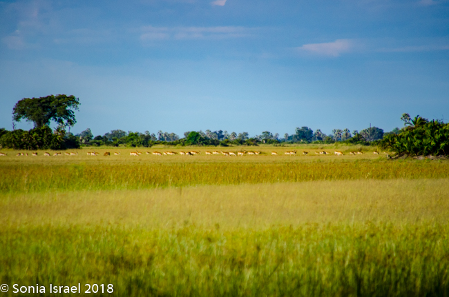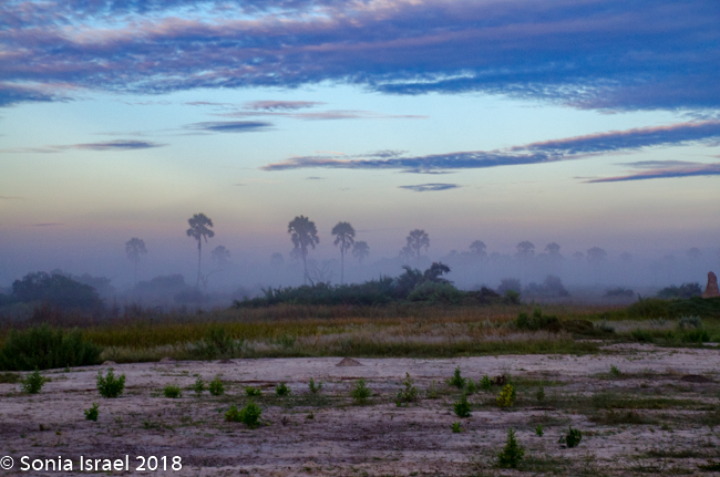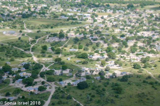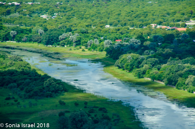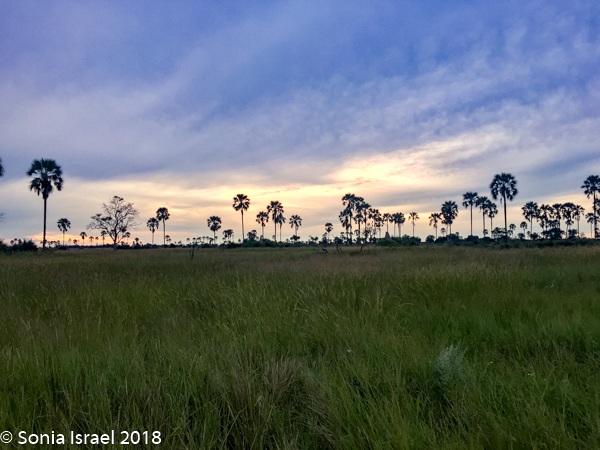 From the sky, the terrain was different shades of green, with wet areas of blue pools reflecting the sky and the clouds or ribbons of river running through the green landscape. Even the very green areas looked like they were wet, as if you stepped on them, you would fall right in. The pools looked like large spiders with legs coming out of the body. There were clumps of trees and separate clumps of palm trees. And there were huge towers which turned out to be termite mounds.