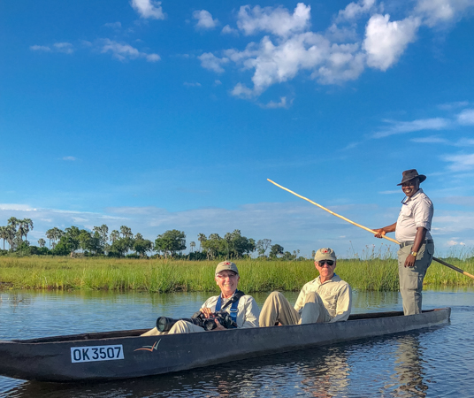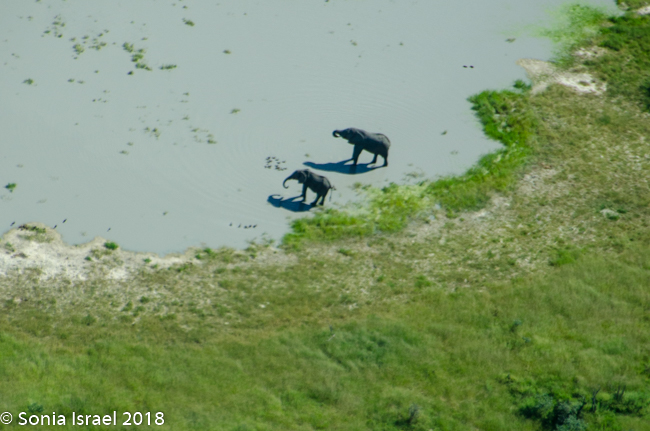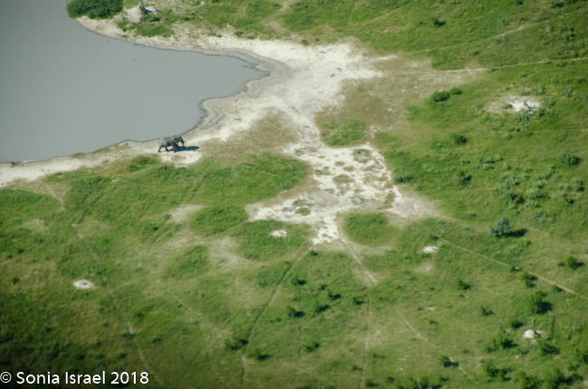 Suddenly someone called out “elephant,” and sure enough there was a lone elephant way down there, drinking from a pool. We saw giraffe and a few more elephants, but mostly we enjoyed the views of the land. The vastness of the delta. Rivers winding through. Pools reflecting the clouds and very blue sky. The lone elephant or giraffe.