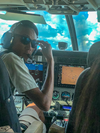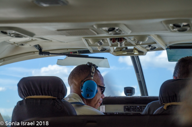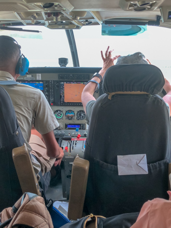 The plane was a small 12-seater prop plane. The pilot introduced himself and had us all stand in the shade at the side of the plane while he gave us the safety instructions. The stairs leading to the plane were flimsy and only one person was allowed on them at a time. There was a bench (like in a car) for two on one side and a single seat on the other. Since there were so few of us, we could each get a window. And then we were off.