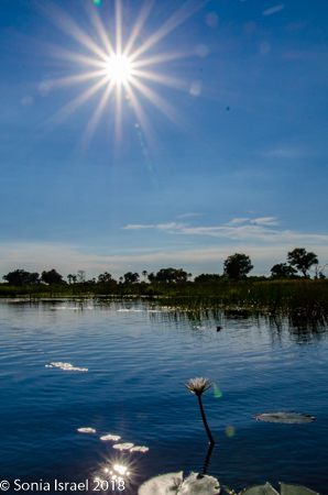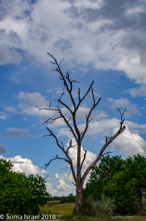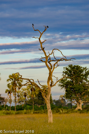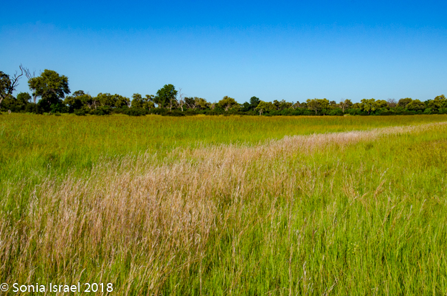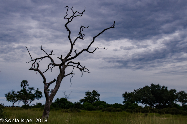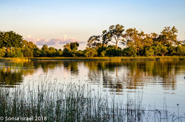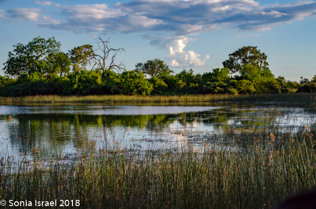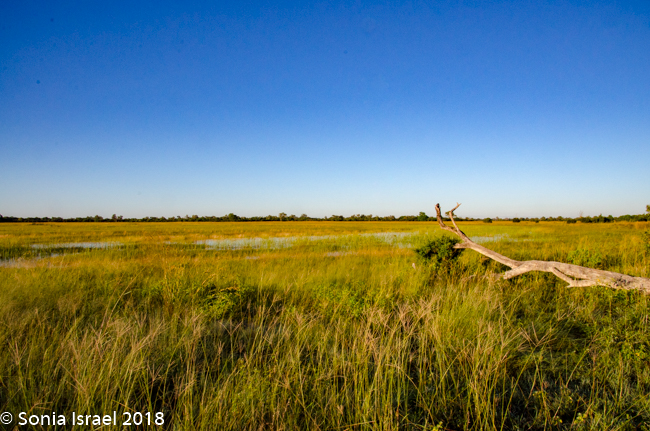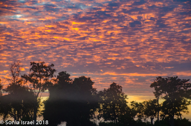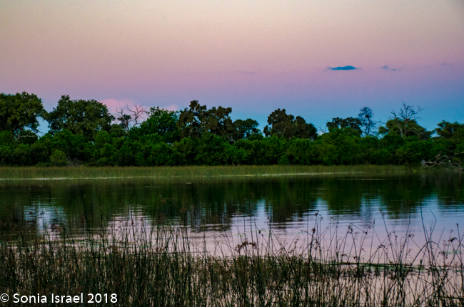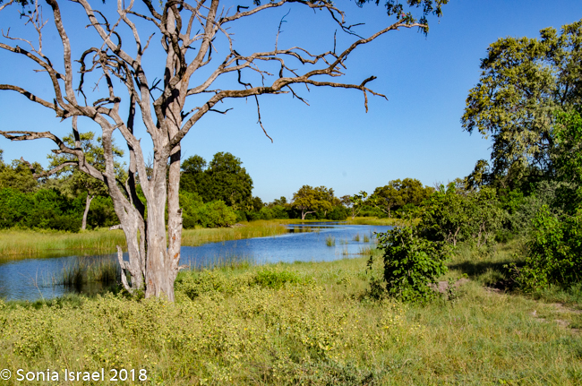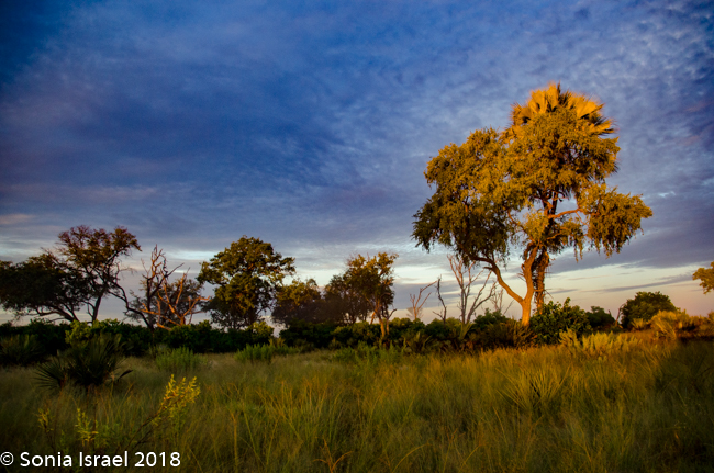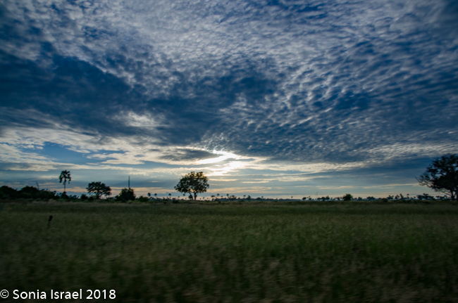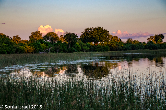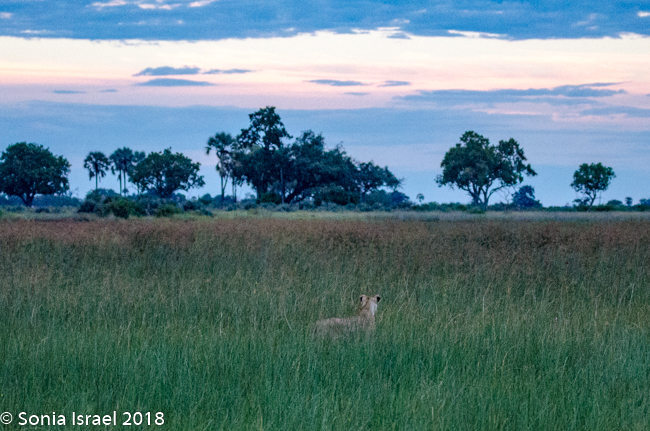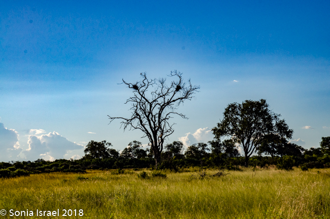 The delta and the river areas are spectacular. Every area is spectacular. Only after you have been here do you understand why people keep coming back again and again. There is 360 degrees of beauty with undulating grass in shades of dark and light greens, yellow, red, with purple, red, yellow and white flowers and the bluest sky, sometimes spotted with the whitest clouds. The dead trees look like sculptures against a blue canvas. The termite mounds rise up reaching for the sky. In the early morning, as the sun is rising, the light is magnificent, a soft yellow, almost orange cast. There is a light chill in the air, the breeze from the movement of the car hits your face. The sunrises turn the sky into fire. And the sunsets are dark blue with pink and orange, with the trees and animals silhouetted in the sky. This is Africa.