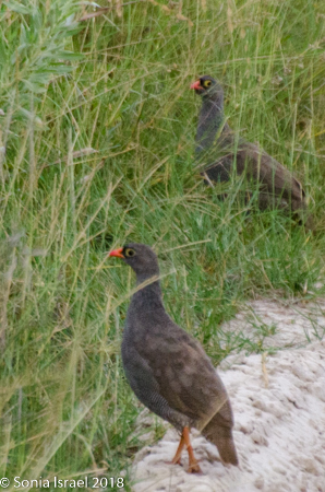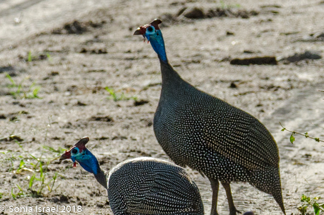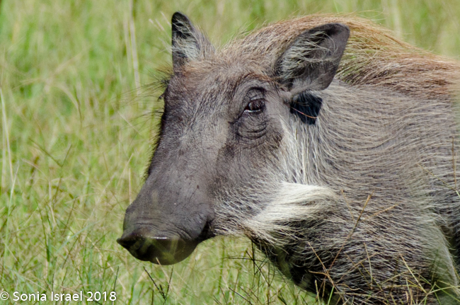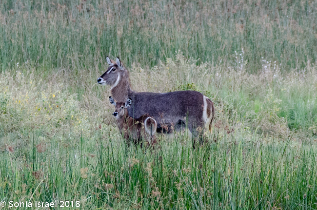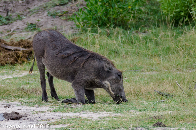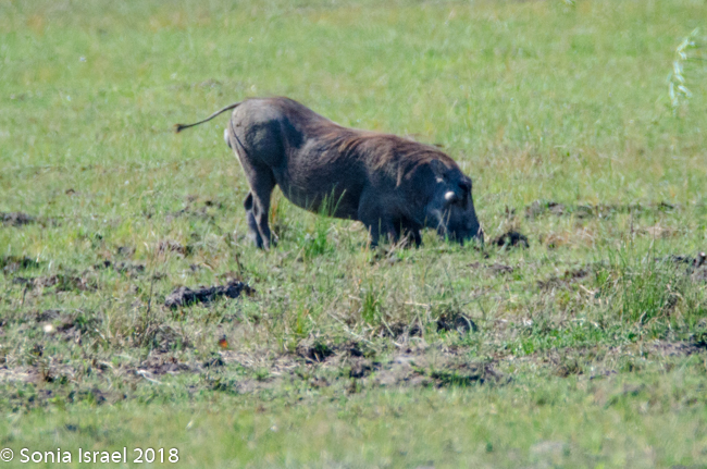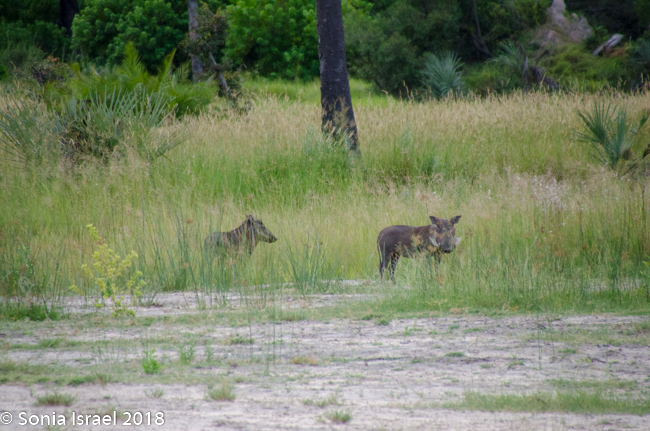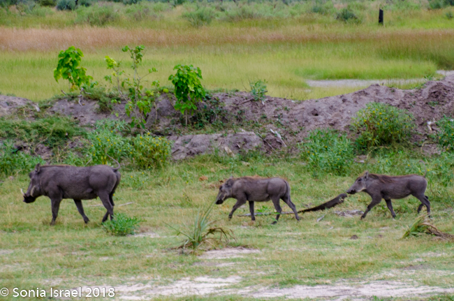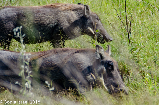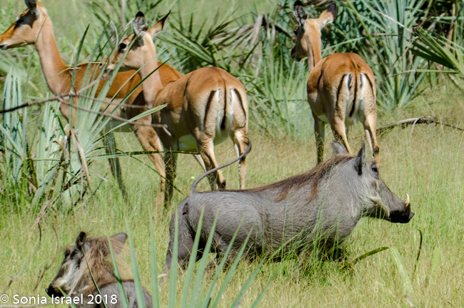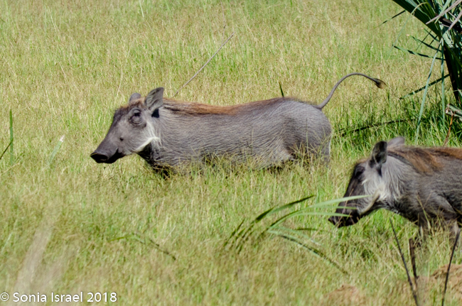 If you had asked me what I thought of warthogs, I would have told you it is one of the less beautiful animals (I’m being polite – I would have said it was quite ugly). But not anymore. Once you watch them, you realize how very cute they are. First, they hang out in families (called a sounder) with related females and their offspring. We saw quite a few mothers with the babies trotting behind them. The males live alone or in bachelor groups. When they walk, their tails stand straight up into the air, like a flag for everyone to see and follow. And when they dig for roots, they get down on their front legs, with their behinds sticking up. Even unborn warthogs have callouses on their elbows to prepare for a lifetime of being on their knees eating grass and roots. The are considered nature’s gardeners as by digging they till the soil, aierating it and softening it for the rain to sink in. We saw lots of them around the antelopes and impalas, totally ignoring each other and sharing in their space. And they are fearless, trotting into water holes, not caring what other animals might be around.