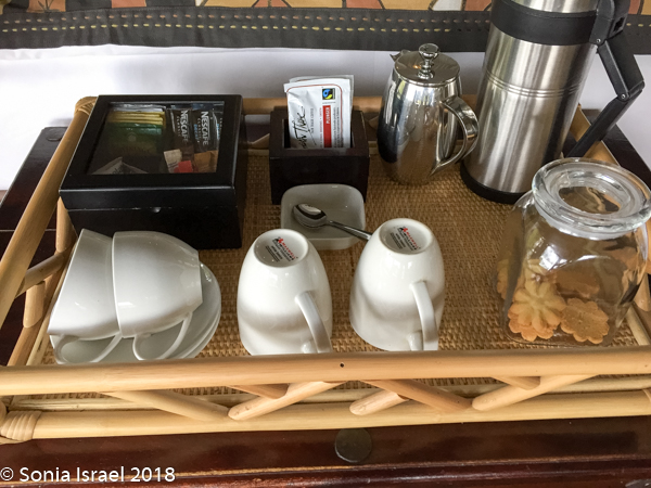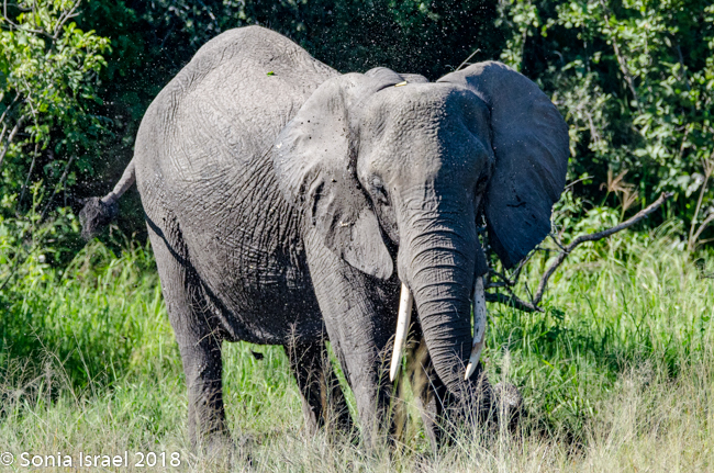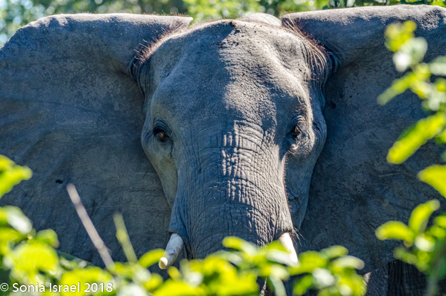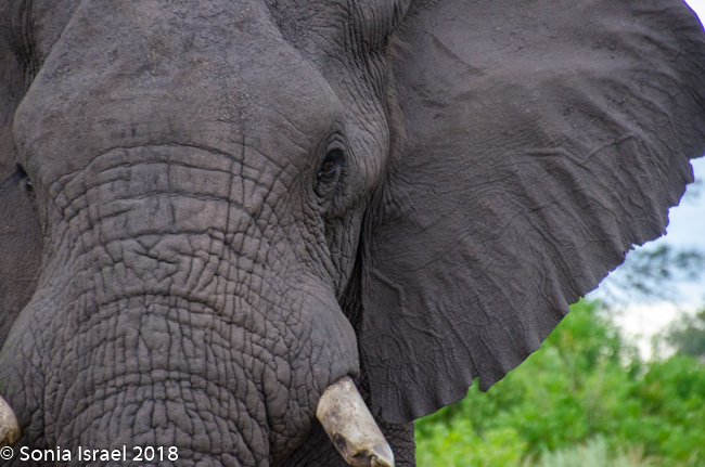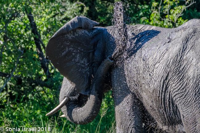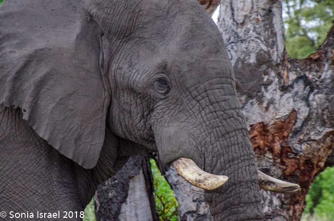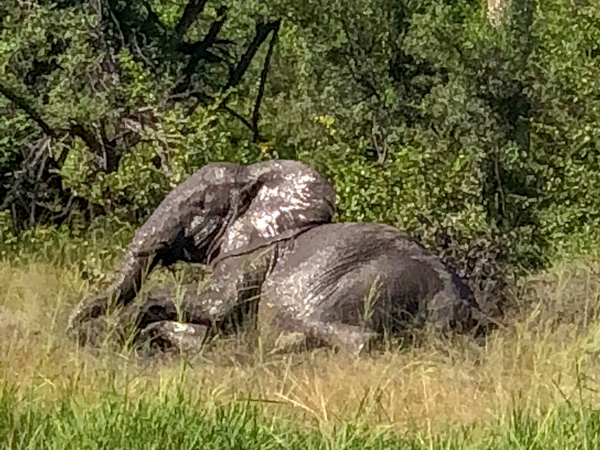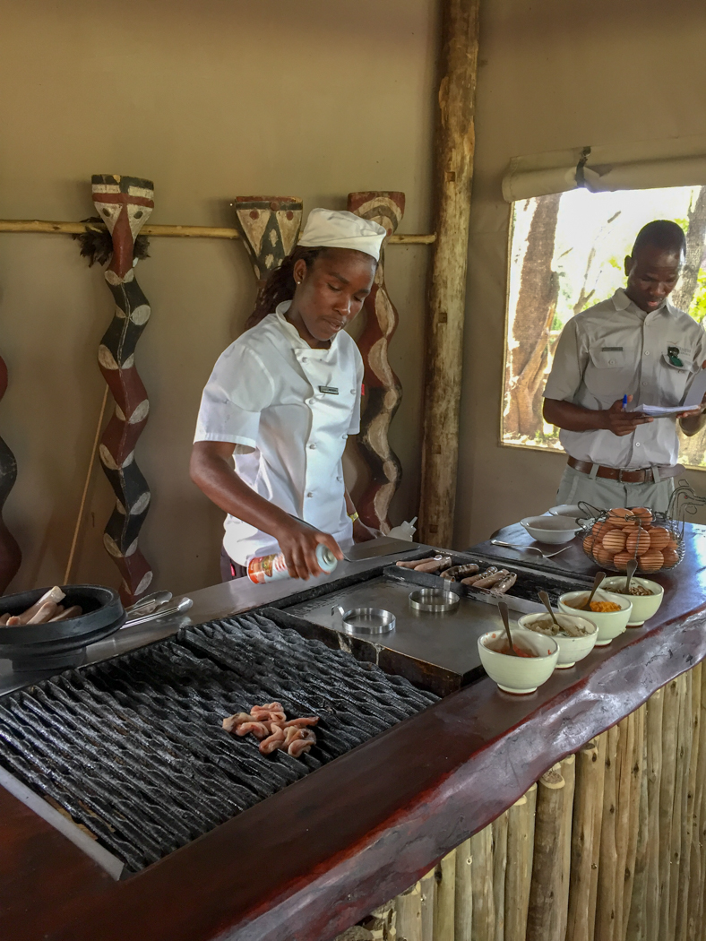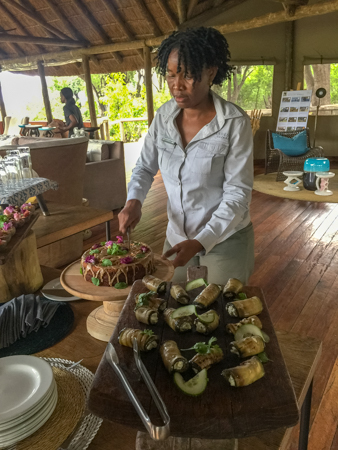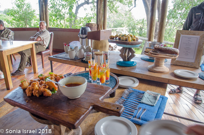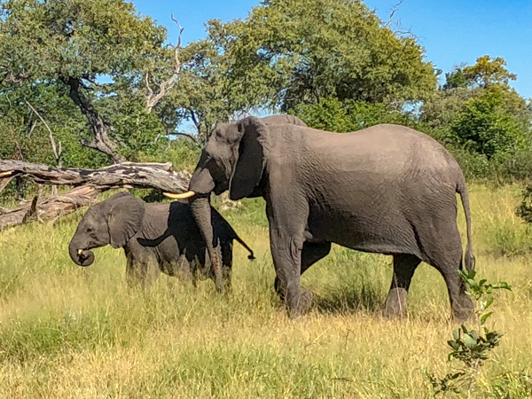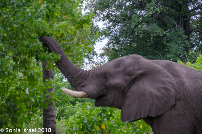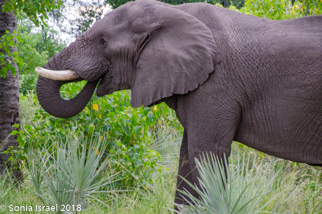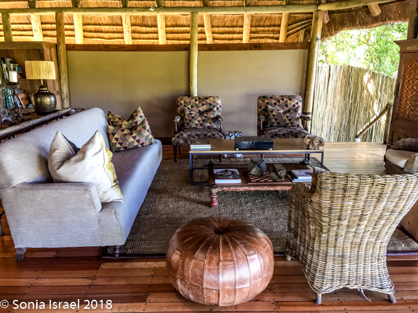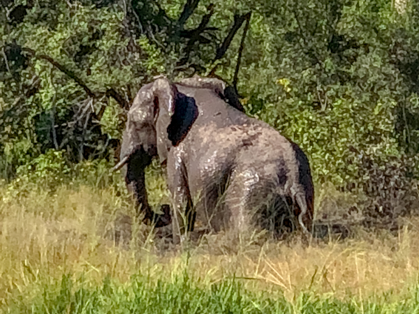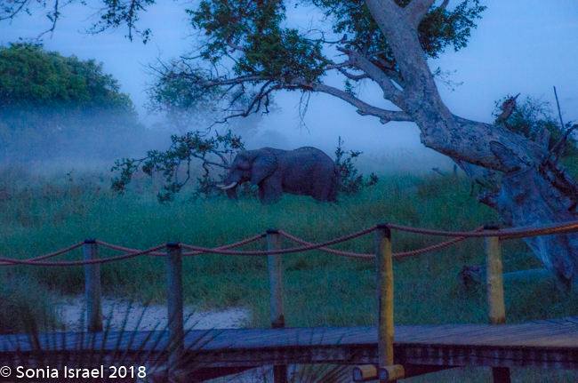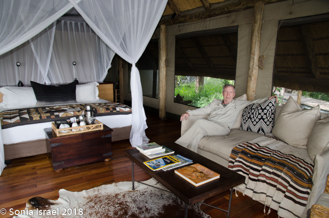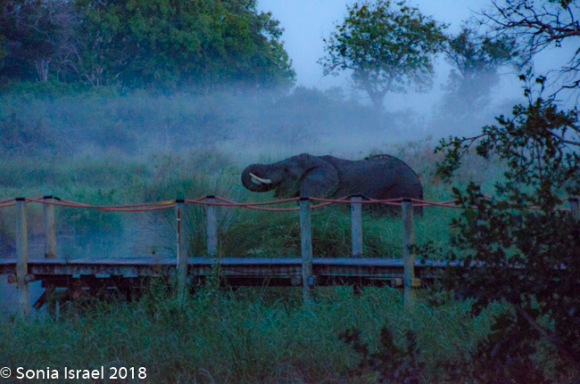 We had arrived in time for tea and snacks. Taswell, the hotel manager, sat us down for the house rules. No walking alone at night; we must be shown to our room by a staff member. Blow the air horn in your room three times if there is an emergency and turn your lights on. If you hear someone else’s air horn, turn your lights off (so they know which tent has the emergency). Always keep your eyes open as this lodge is not fenced in and there are animals everywhere. And as if to prove his point, an elephant appeared, just sauntering along, right by the camp. Yes! That is why we came to Africa.