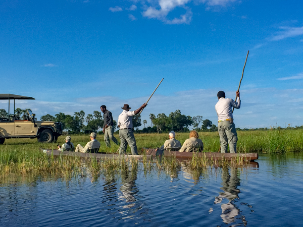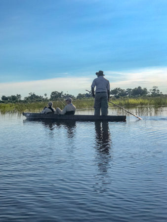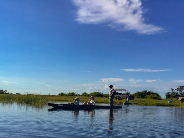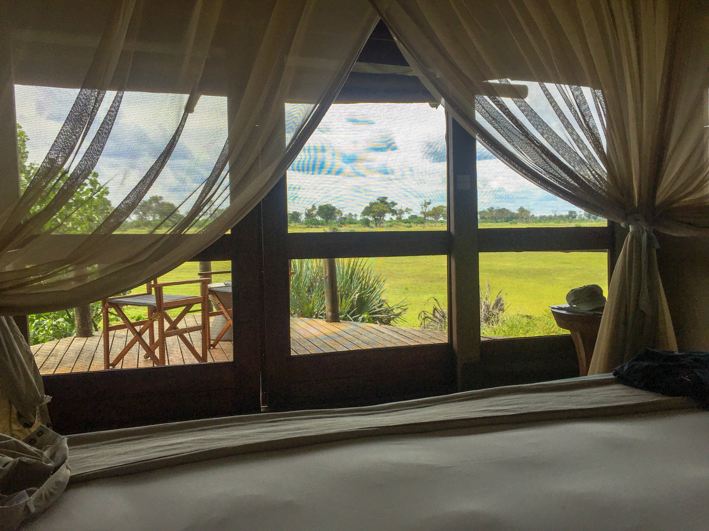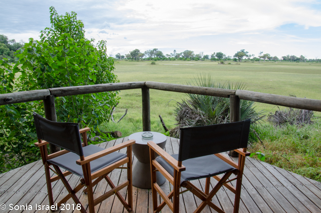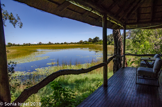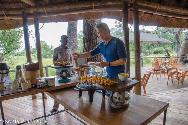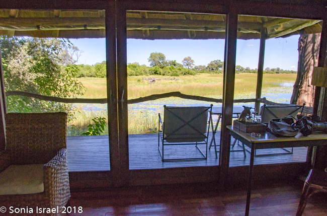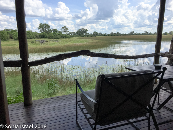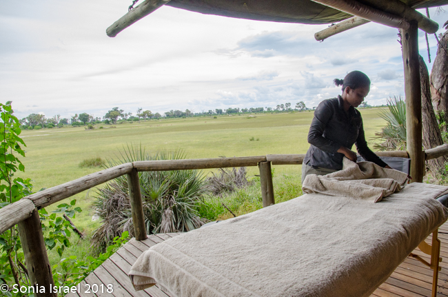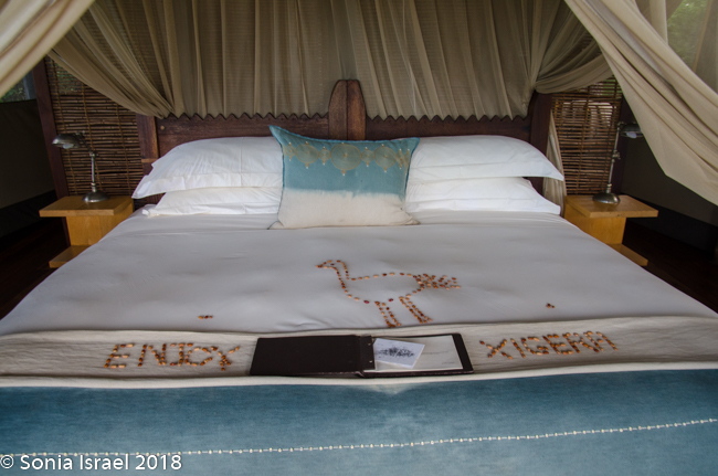 We were then shown to our rooms. We were in tent 5 of 9 tents, all of which overlooked the Okavango Delta. On our bed were beans spelling out “Welcome to Xigera.” We freshened up quickly and made our way back to main dining room to head off to our first outing.