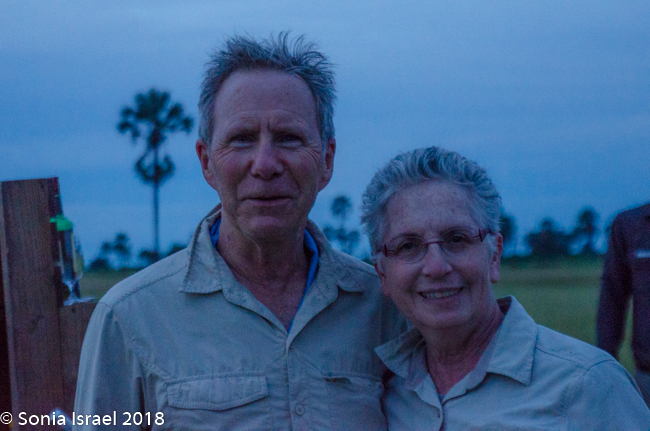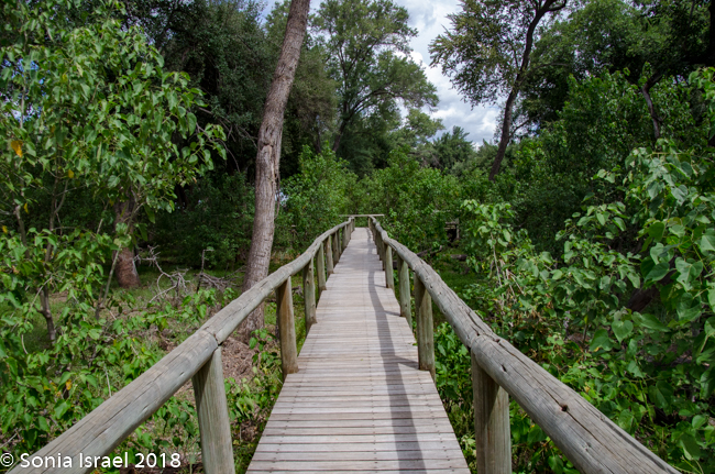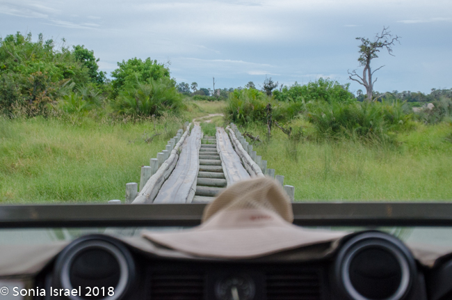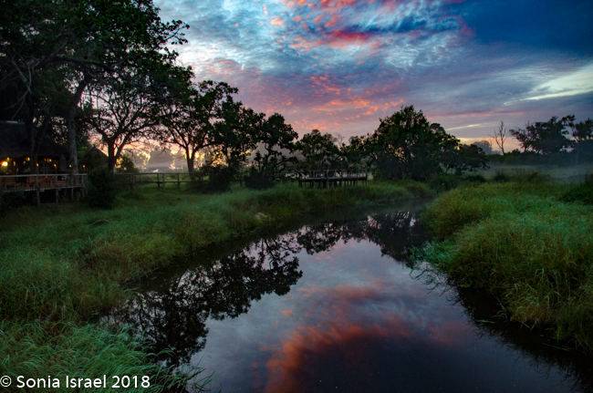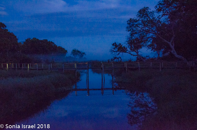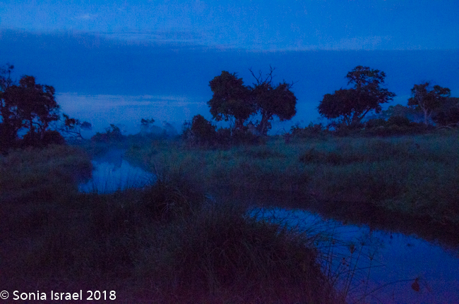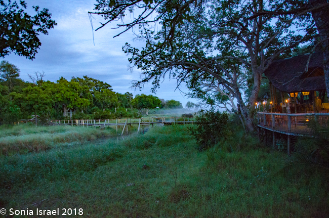 creating a tunnel of light surrounded by darkness. We arrived back at camp, and as we walked across the bridge to the lodge we could hear what sounded like very loud castanets. But we were in Africa, not Spain. There would be no flamingo dancers (although there could be flamingo birds). It was the frogs. Very loud frogs, along with some very loud insects, sounding just like hundreds of castanets.