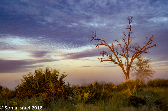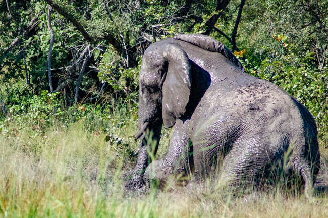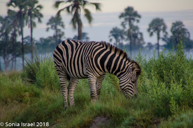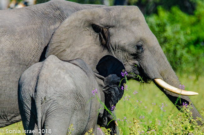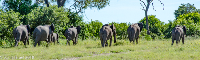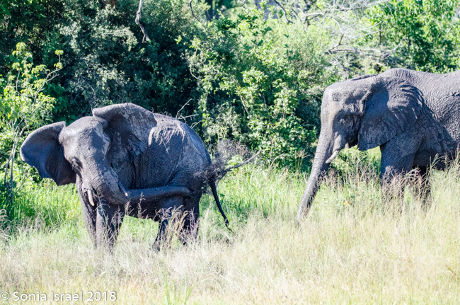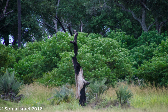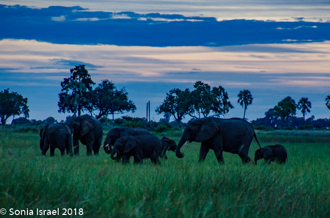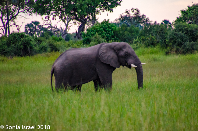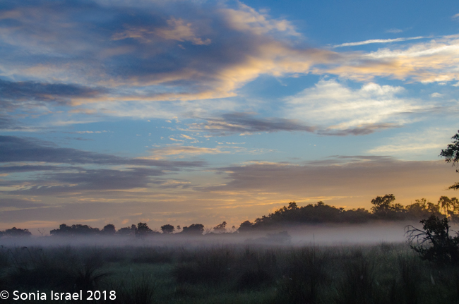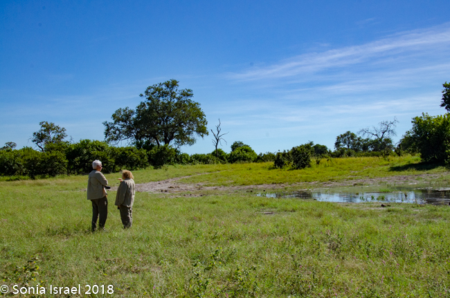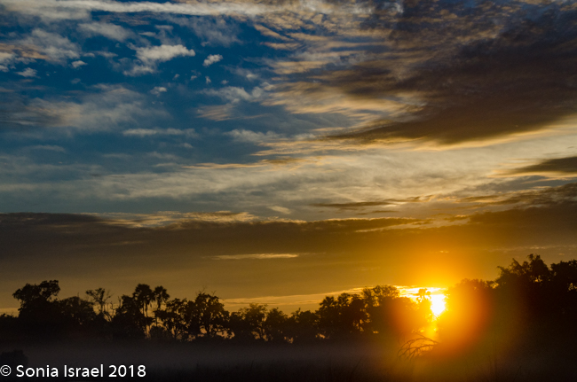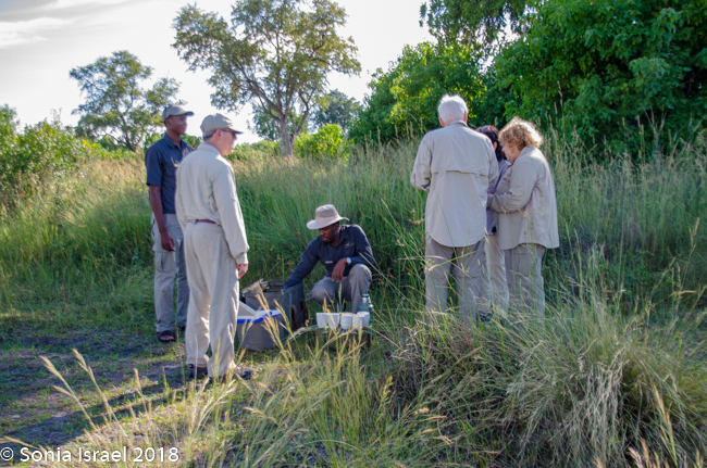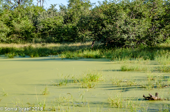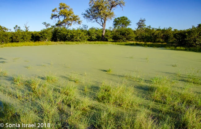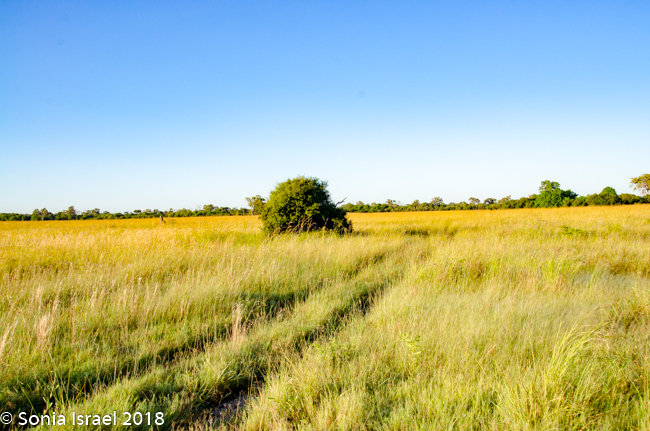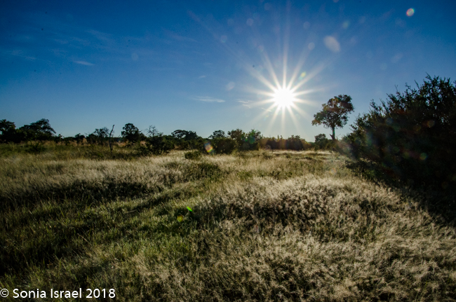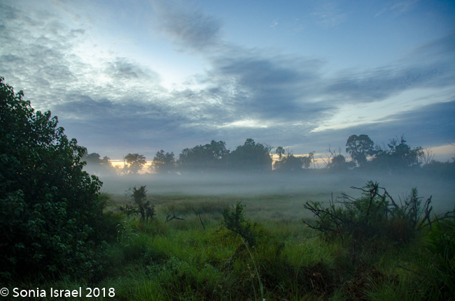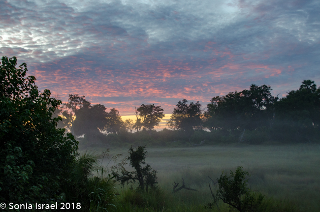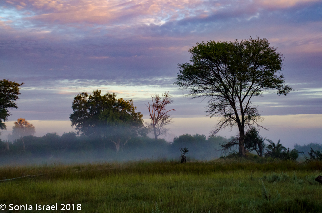 Driving around the Linyanti area, I couldn’t help thinking about how incredibly beautiful the terrain was. It is a mopane woodlands, with the mopane tree only growing in Africa. And the LInyanti area is half a mile above sea level. We were driving through tall spear grass, knocking it down and then watching it pop back up like a jack-in-the-box. But here, unlike in the south of Botswana, there were more trees rather than just grass and bushes. The trees were full of leaves and birds, against a brilliant blue sky. Most of them. Some trees had been struck by lightning and looked instead like black and white sculptures. The ground at parts was more dirt and less grass and looked cracked, most likely from paths created by the animals trekking across the land. And the colors kept changing as the sun rose and then set. The shades of grass would go from a glistening light green to a dark green with everything in between. There were little flowers everywhere in purple and white and yellow and pink. There were little flowers in the Hibiscus family, what we would call primrose. The still water ponds were covered in a green sheen caused by duck weed, which made the water pop out amongst the darker green grass around it. And then there was the mystical fog which hung like a curtain making everything look ethereal. And of course, there was the smell of the bush, which I tried to describe above. The breeze hit us in the face and we would take big breaths to inhale the smell of Africa. Goodman would say to us, “Smell the elephant? Smell the water? Smell the grass? Smell the wild sage?” Smell the bush.