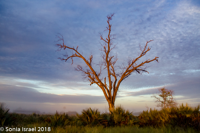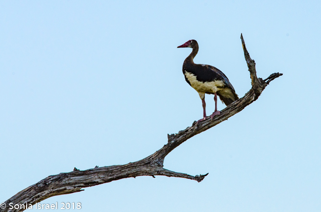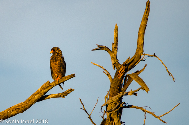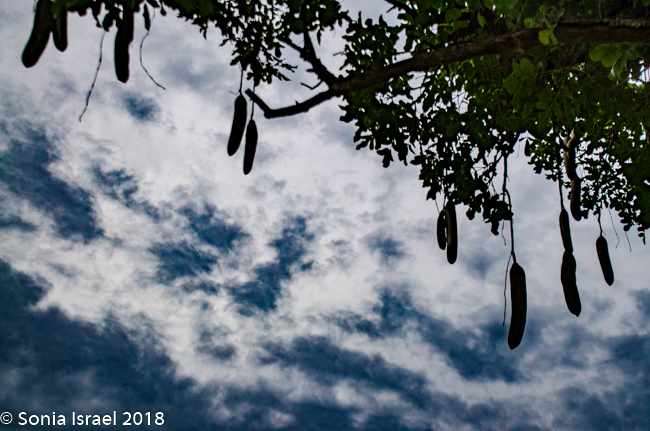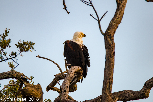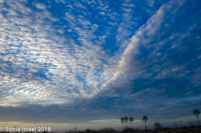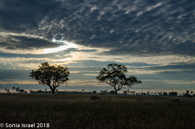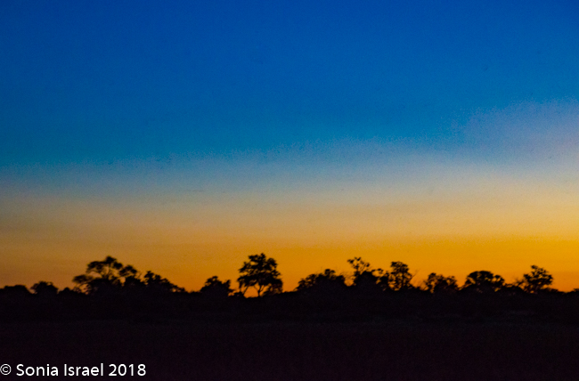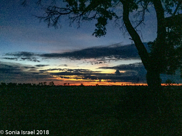 The sky in the bush changes from one set of incredible colors of red, yellow, orange, pink at sunrise, to a brilliant blue dotted with white clouds to a second set of incredible colors of purple, dark blue, orange, pink at sunset. The trees, and the animals, are all silhouetted against the sky. Some of the trees have been hit by lightning and look like black and white sculptures. And sometimes, the shadows on the trees look like birds.