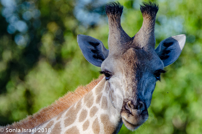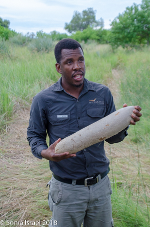 The Land Rovers have three rows of seats, each a bit higher than the one before. You have to climb up to get in. No doors that open. There was a canopy over our heads, but otherwise it was open on all sides. We began the drive and almost immediately saw a bushbok with its white spots (also called imbabala and related to the Bongo which is my favorite animal!), right at the side of the dirt road near us. We stopped to take pictures, and then Kitso started the engine and headed forward again. But we quickly made another stop as we saw some kudus. We saw lots of antelopes and impalas. And springboks. The springboks are the smartest as they bury their poop to hide the scent and keep from being detecting by their predators. And then there was a lone male elephant, ambling along. There was a giraffe. Each was amazing to observe. The giraffe would nibble on leaves, then stop and look around, sometimes right at us. Then he would eat some more. We knew it was a “he” because male giraffes are darker in color.