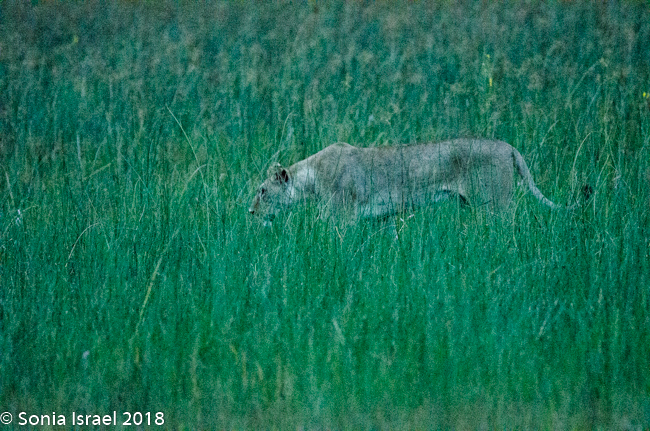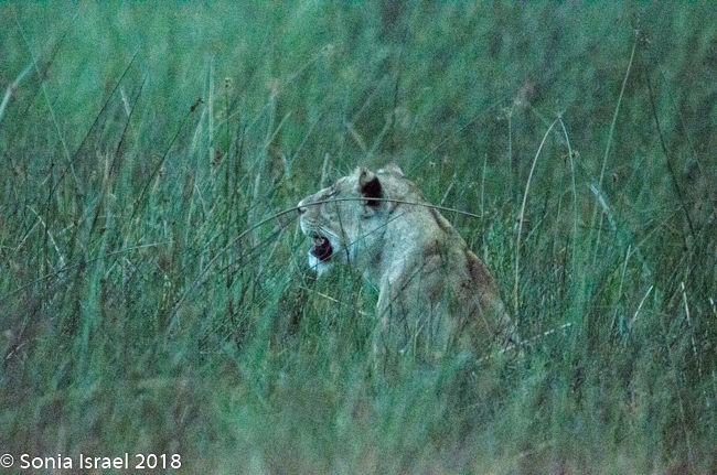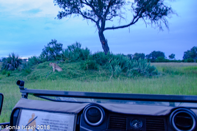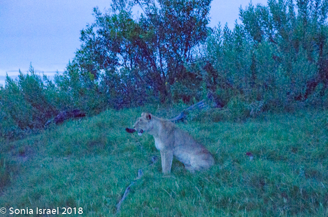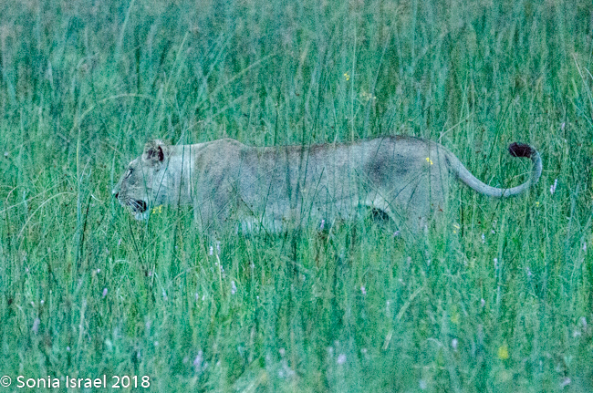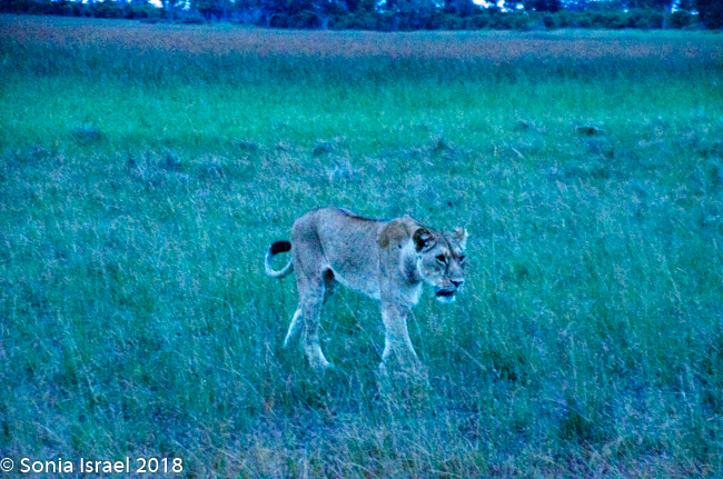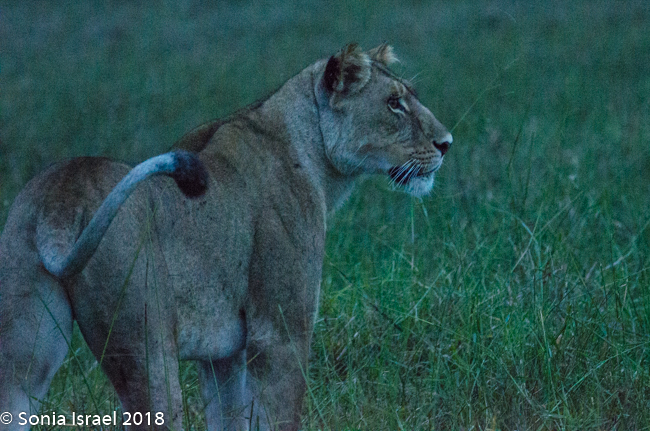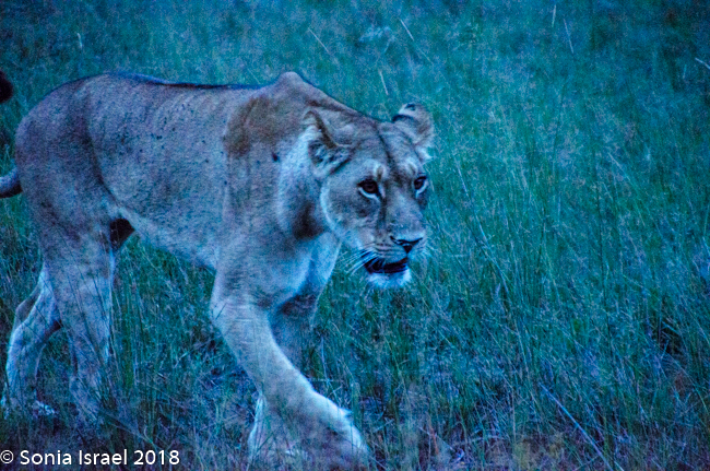 course for the clicking of the cameras. And she was beautiful. Be-u-ti-ful! Where was her family? Was there a lion she lived with? Were there cubs? Was she stalking for food to feed her family? Or was she all alone? Of course, we will never know. But we enjoyed every moment of watching this incredibly elegant, sleek creature. The sun had set. It was dusk. It got darker and darker. And still we watched. It was no longer boring!