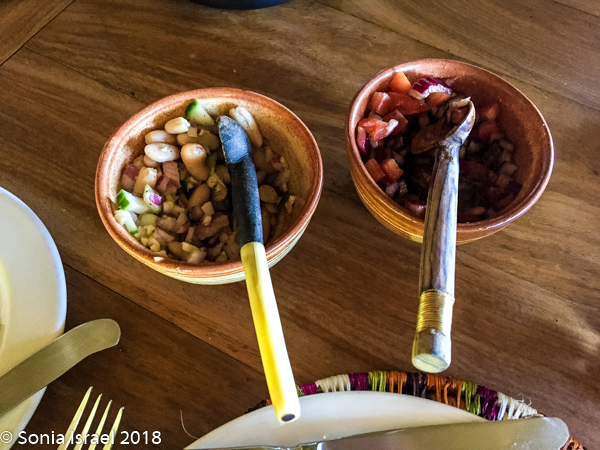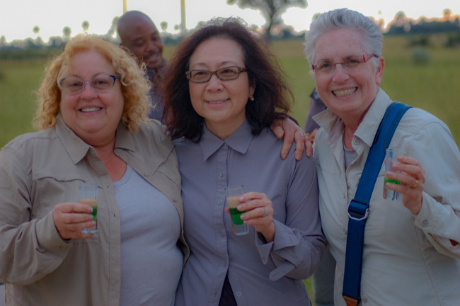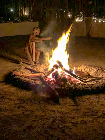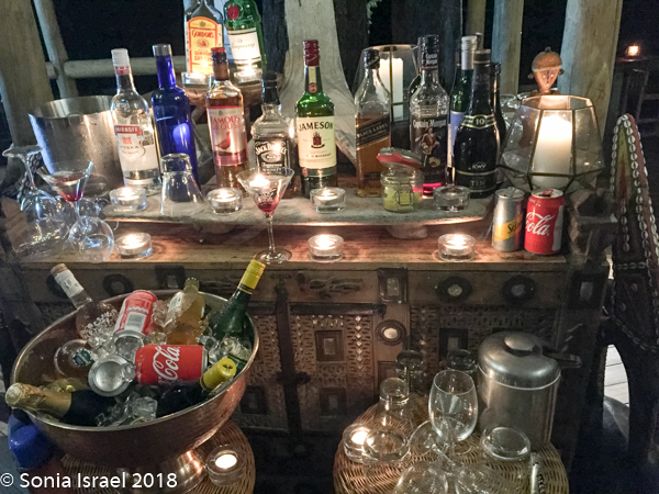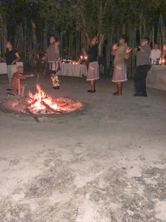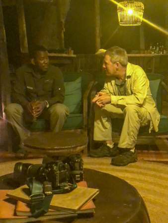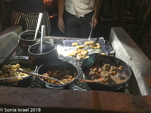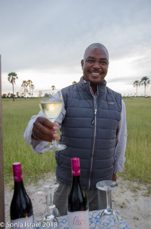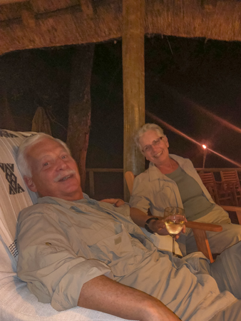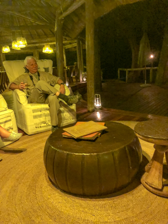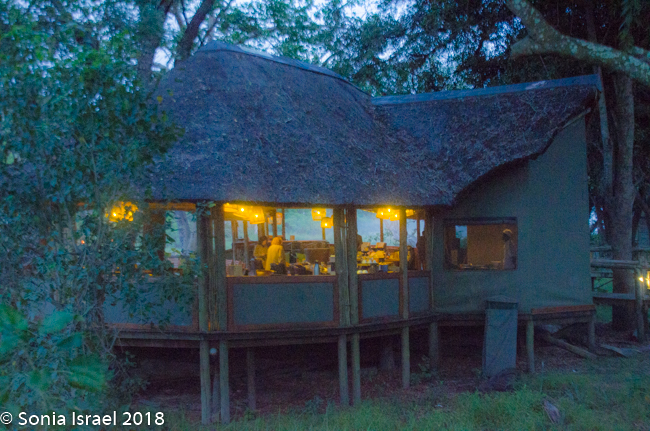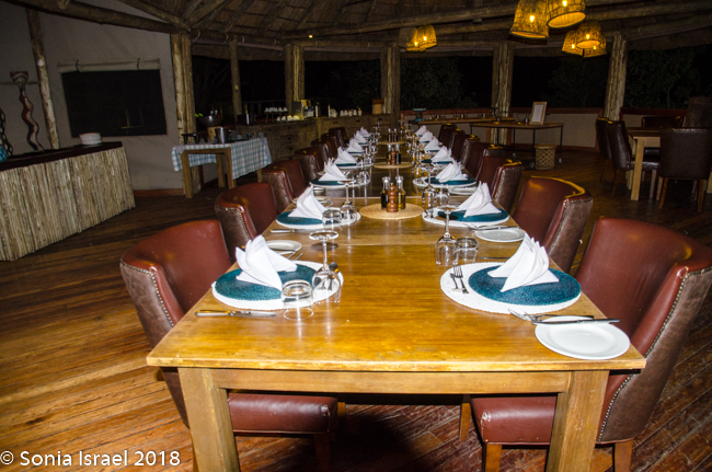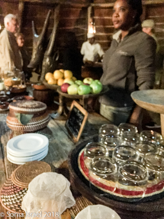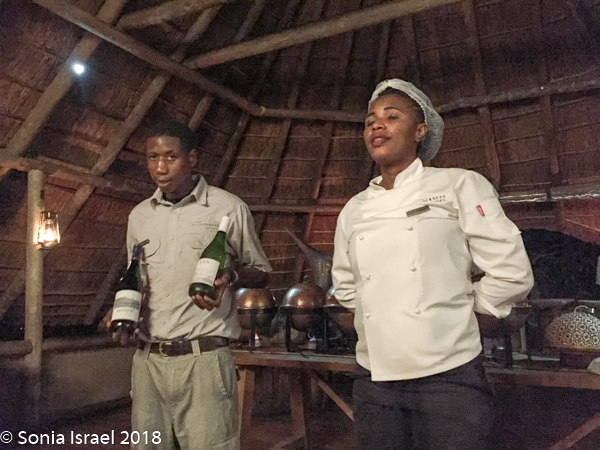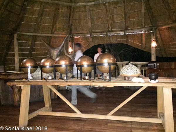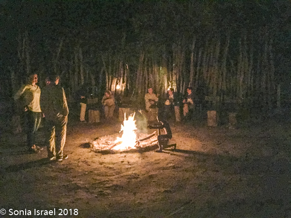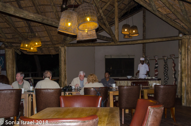 That evening, since it was Monday, the staff performed a show for us with traditional African music, food and dancing, all around a campfire. Seems they do this at each camp every Monday night. While we watched they passed around small bites of African corn soup and other delicacies. They each then took the hand of a guest, danced around the fire with us a few times and then danced us to a long table set for dinner. It was all lovely, but so dark that we could hardly see them.