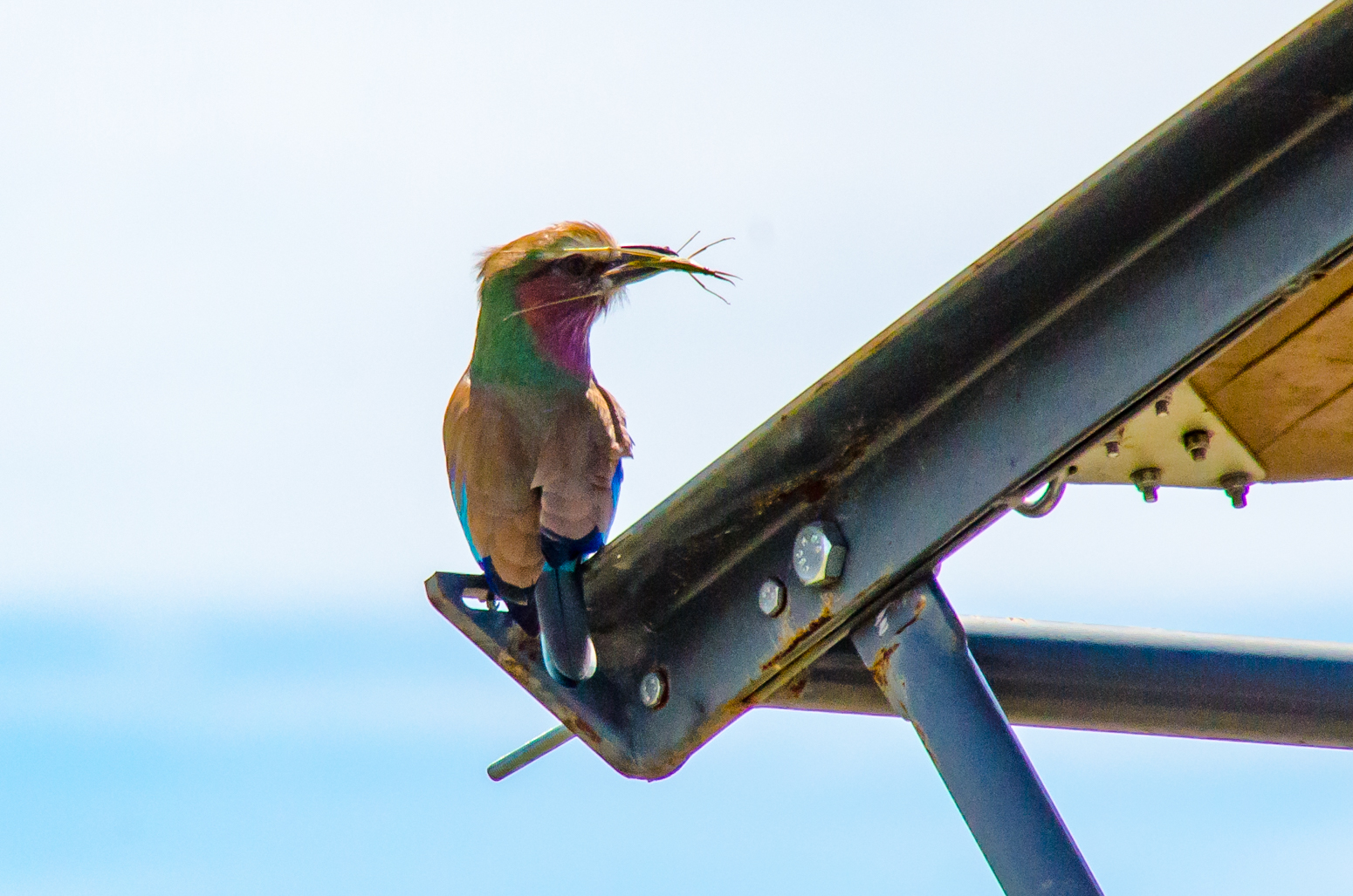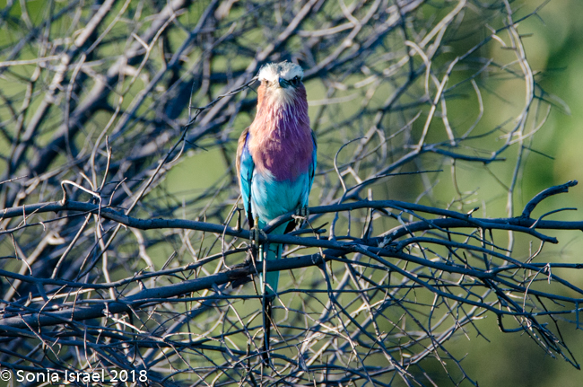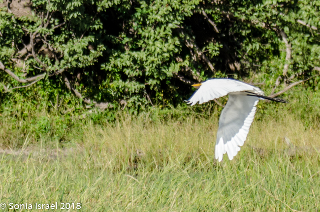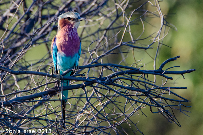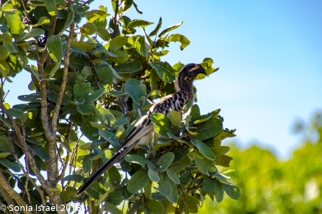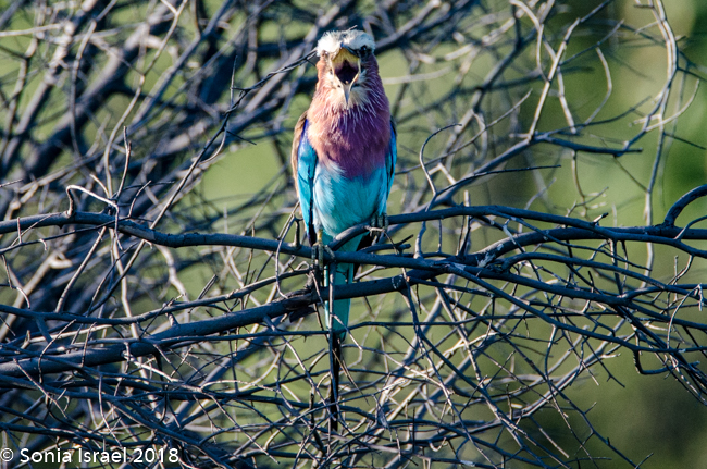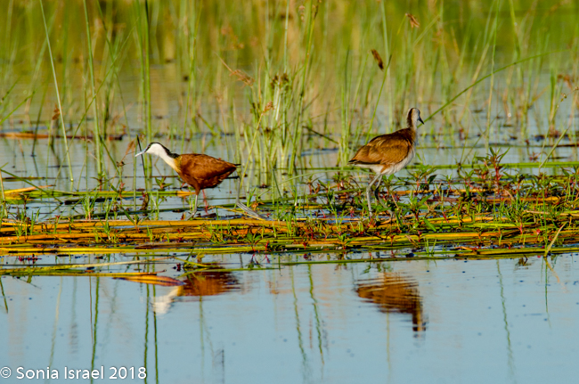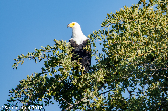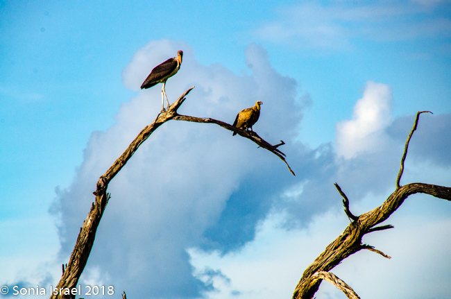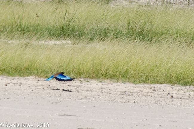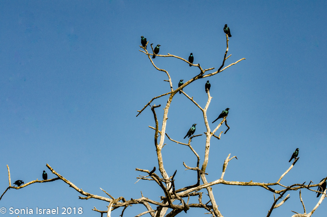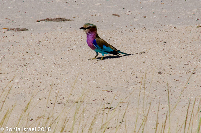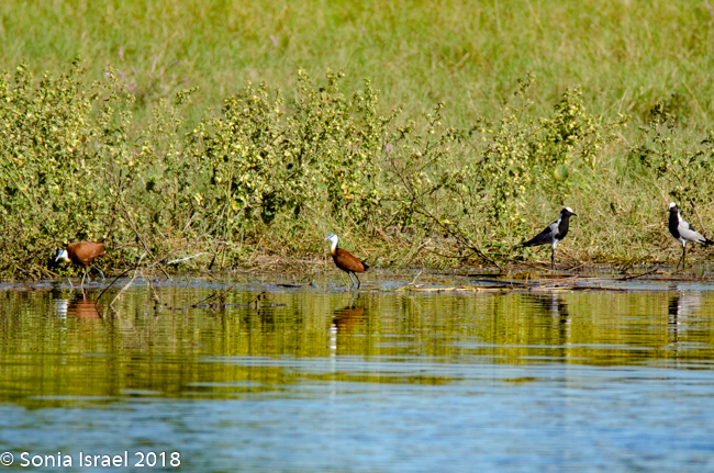 Even watching the birds seemed to be in slow motion. Once in a while the bird would fly away before we could shoot a picture, but most of the time, they just perched on their branches and seemed to be posing. There were birds of all colors everywhere. Over the few days in both Xigara and Savuti we saw Blue Kingfishers. African gray horn birds (and red horn and orange horn and yellow horn; to be honest, in my labeled pictures below, I’m really not sure which are red and which are orange). The Lesser Gray Shrike (a little white and grey bird from Russia). A Kori Bustard (the national bird of Botswana who is the heaviest flying bird and who makes a sound like a drum). The little bee-eater who is yellow and blue with a black stripe on its head and one of the more beautiful birds. Starlings in blue with red eyes. Sparrows who have two toes facing forward and two toes facing backward which makes them steadier on branches. The coppery tailed coucal (in the cuckoo family; it gets all fluffy to preserve heat). Orange bellied Pigmy goose (who we saw eating water lily seeds. Although called a goose because of its stubby bill, it is really a type of duck). An African hawk eagle (who looks like a tree stump). An African Jacana, nicknamed the Jesus bird as it walks on water (it has long toes and long claws that enable it to walk on floating vegetation in shallow lakes. We saw it walking on the lotus plants).Two fish eagles just perched on tree branches. Short tailed eagle. Black shoulder kite. Green pigeons.