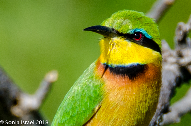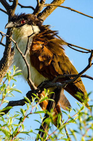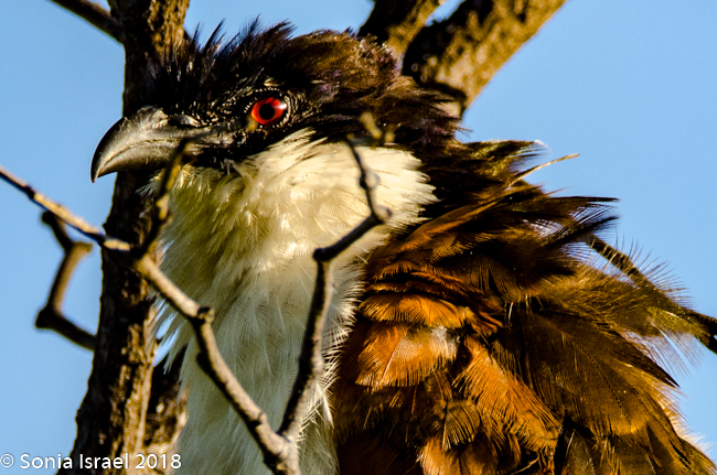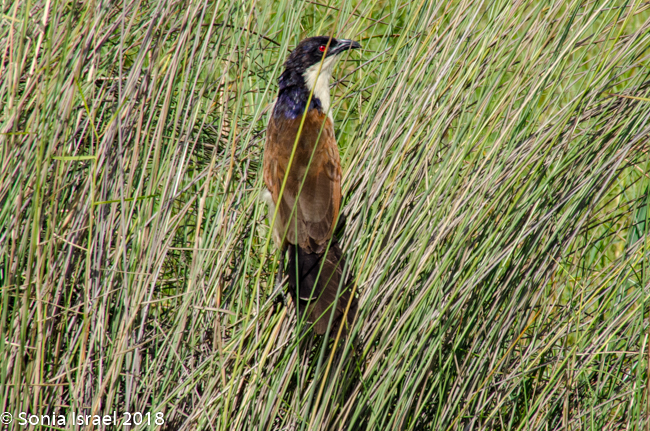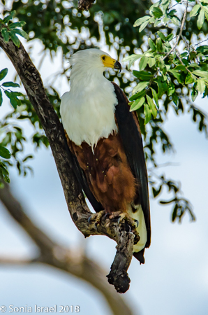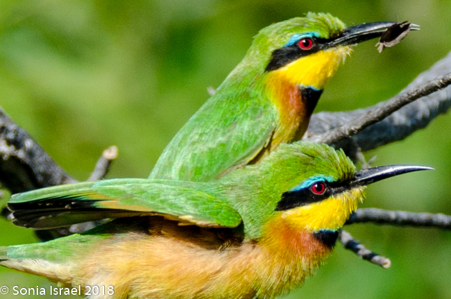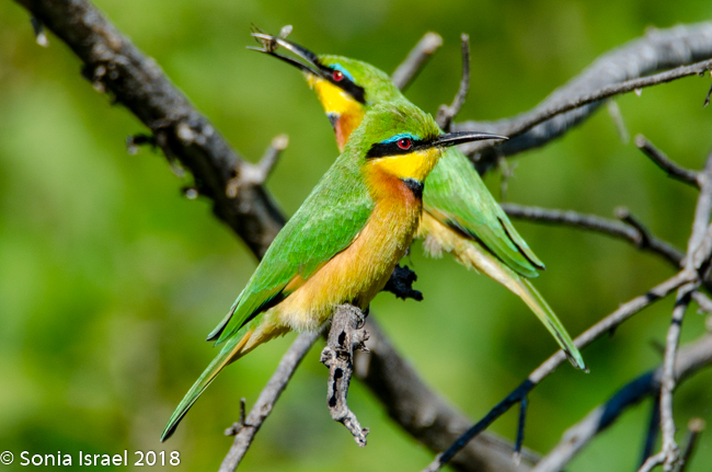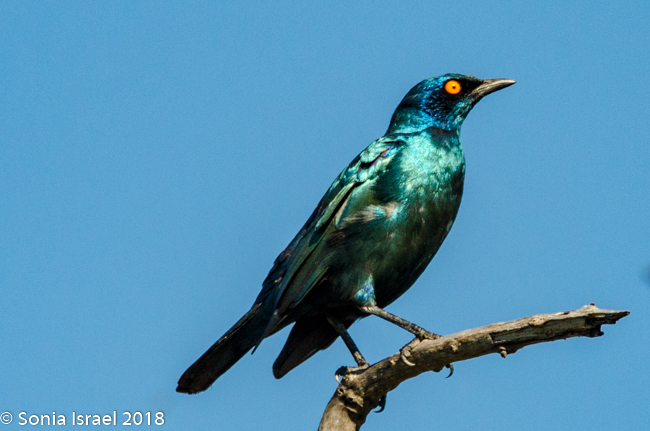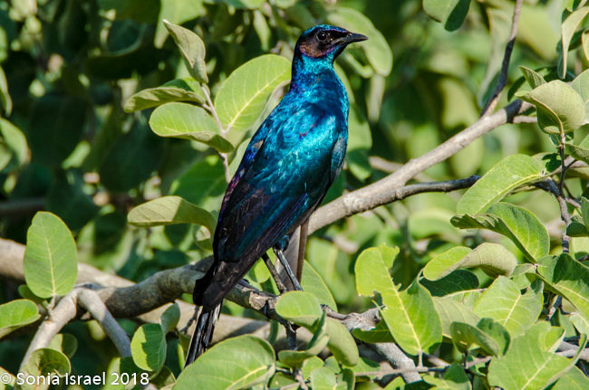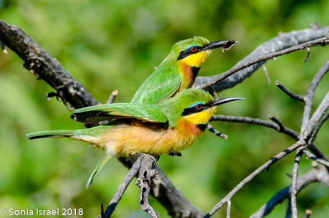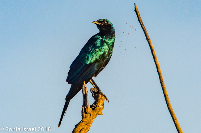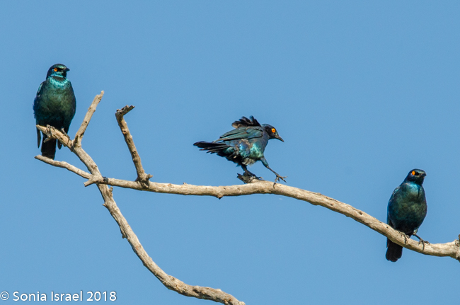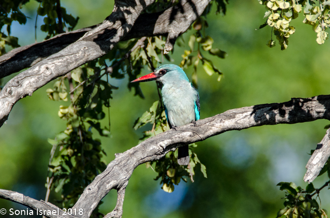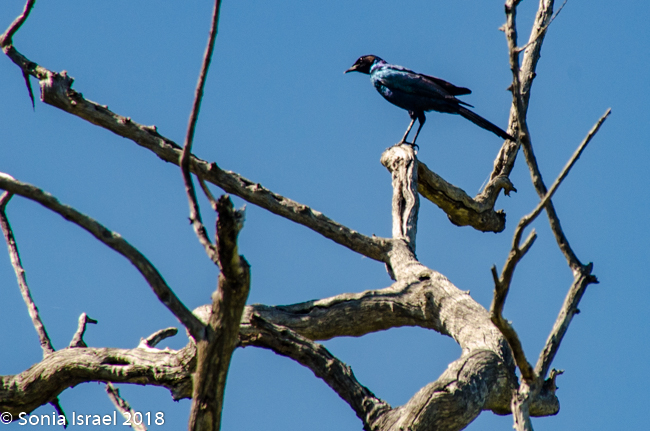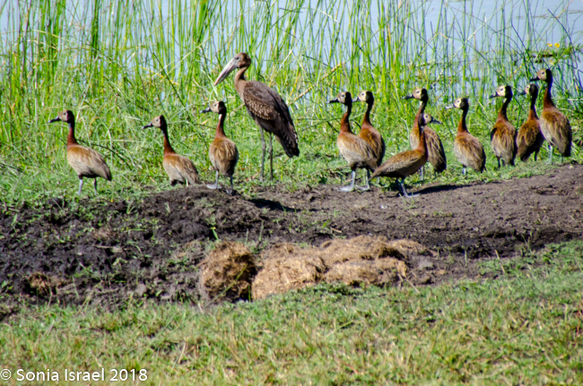 Even watching the birds seemed to be in slow motion. Once in a while the bird would fly away before we could shoot a picture, but most of the time, they just perched on their branches and seemed to be posing. There were birds of all colors everywhere. Over the few days in both Xigara and Savuti we saw Blue Kingfishers. African gray horn birds (and red horn and orange horn and yellow horn; to be honest, in my labeled pictures below, I’m really not sure which are red and which are orange). The Lesser Gray Shrike (a little white and grey bird from Russia). A Kori Bustard (the national bird of Botswana who is the heaviest flying bird and who makes a sound like a drum). The little bee-eater who is yellow and blue with a black stripe on its head and one of the more beautiful birds. Starlings in blue with red eyes. Sparrows who have two toes facing forward and two toes facing backward which makes them steadier on branches. The coppery tailed coucal (in the cuckoo family; it gets all fluffy to preserve heat). Orange bellied Pigmy goose (who we saw eating water lily seeds. Although called a goose because of its stubby bill, it is really a type of duck). An African hawk eagle (who looks like a tree stump). An African Jacana, nicknamed the Jesus bird as it walks on water (it has long toes and long claws that enable it to walk on floating vegetation in shallow lakes. We saw it walking on the lotus plants).Two fish eagles just perched on tree branches. Short tailed eagle. Black shoulder kite. Green pigeons.