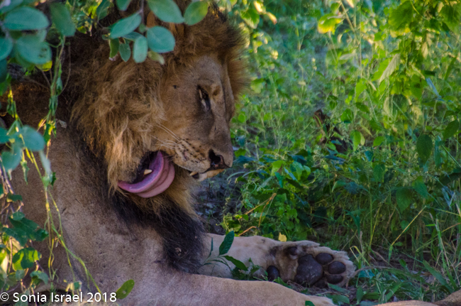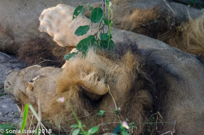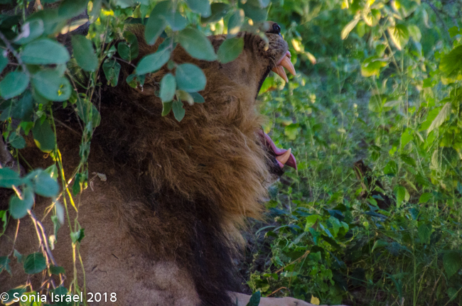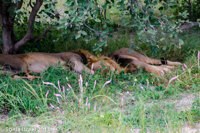 We drove and we drove and we drove. This is Africa. You have to drive around and get to where the animals are, you have to track them and search for them and hope you find them. And find them we did. They were indeed two lions sleeping under a tree. These lions had black manes which meant they had good genes and came from the Kalahari.