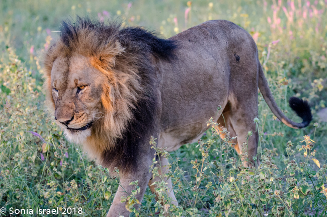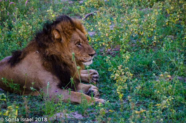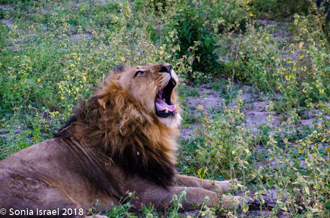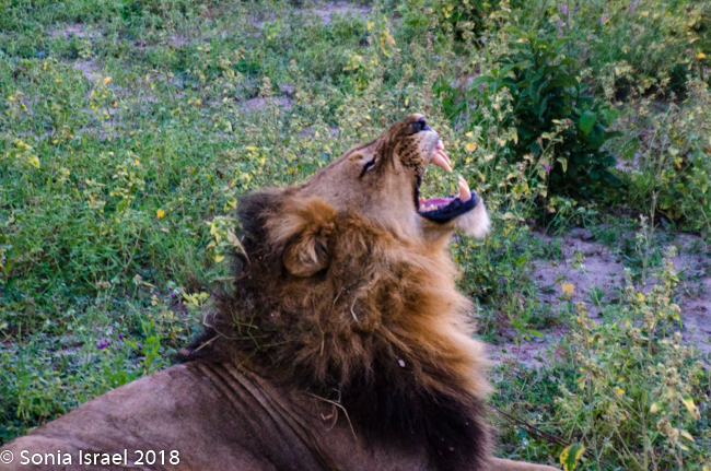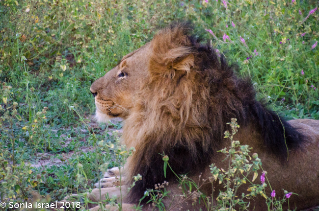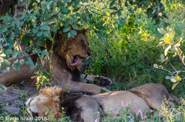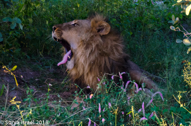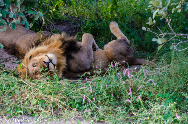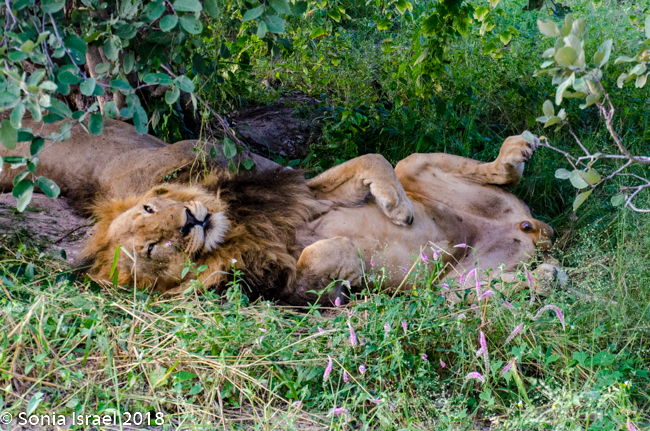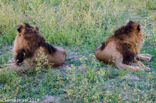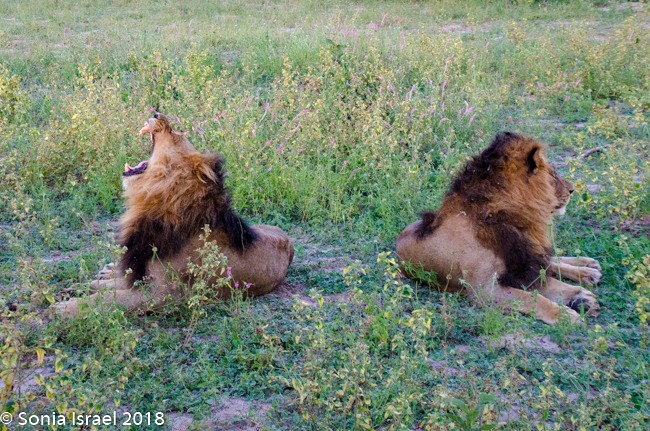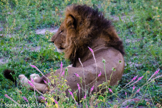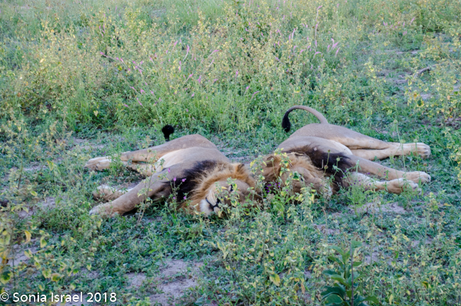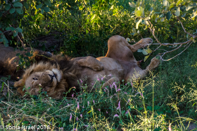 It was about 5:00 when we got there and Goodman announced that the lions would wake up at 5:30. Well, 5:30 came and went. One lion would lift us his head, look around, and go back to sleep. The other barely moved. 6:00 came and went. Their sleep inertia was strong. But finally, at about 6:15ish, they finally started to wake up. One sat up, yawned, began licking himself and then strolled out from under the tree to relieve himself. The other slowly followed suit. We moved the Land Rover so we could keep watching them walk around, lie down again and go back to sleep. Get up and move a bit more. They were walking in a field of flowers as if in a painting.