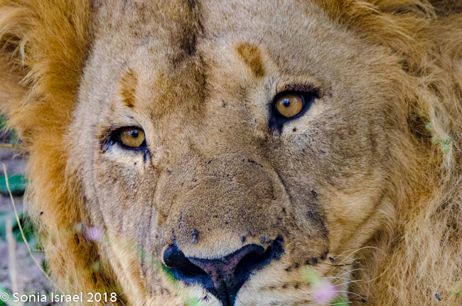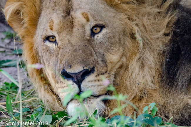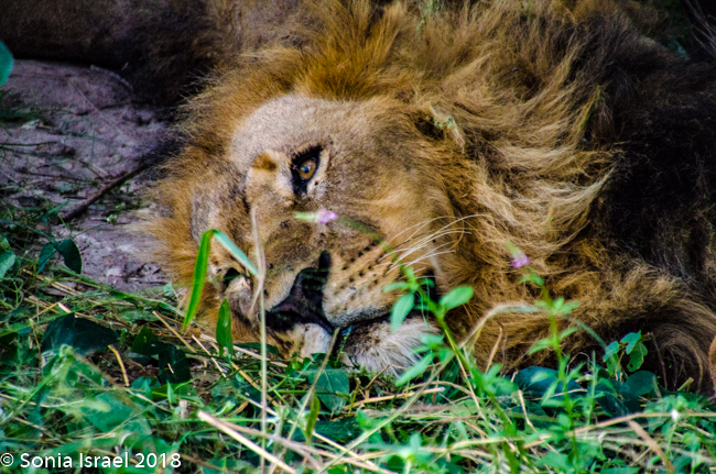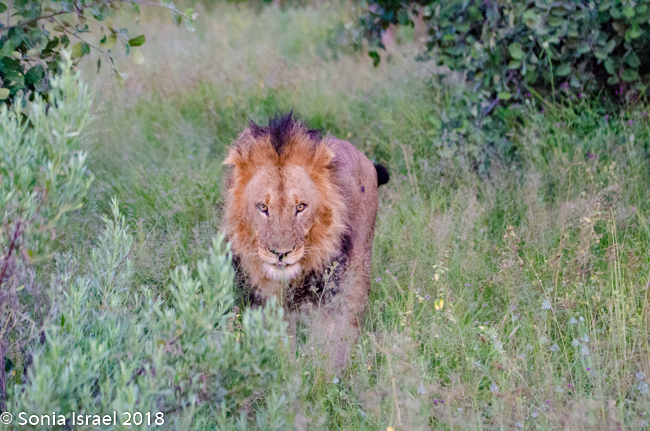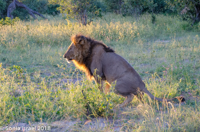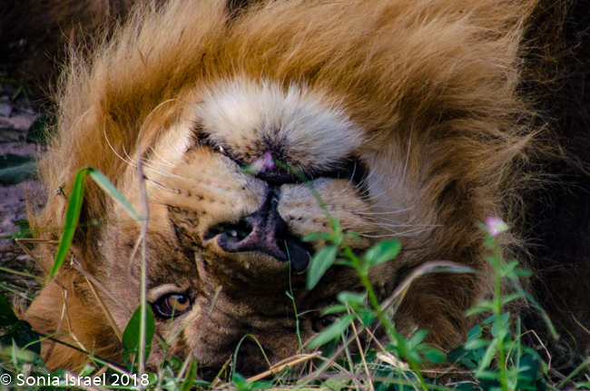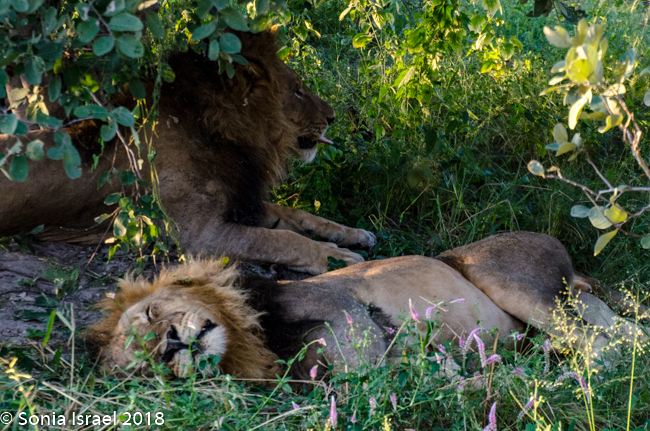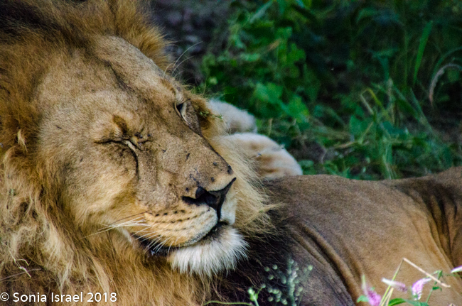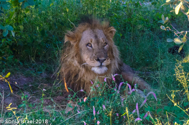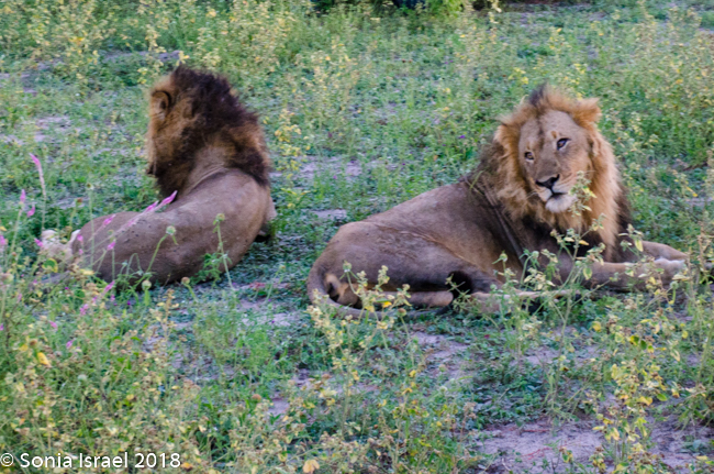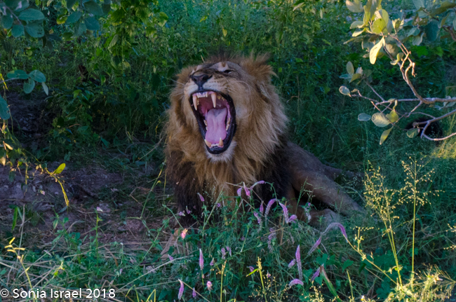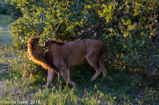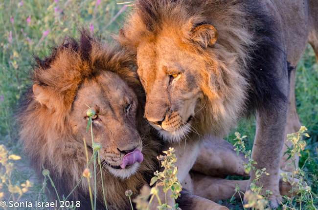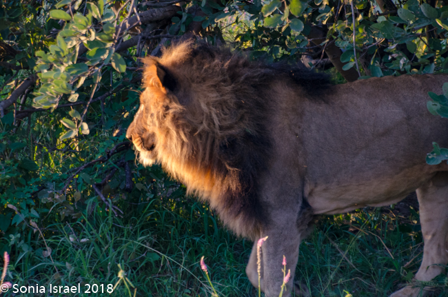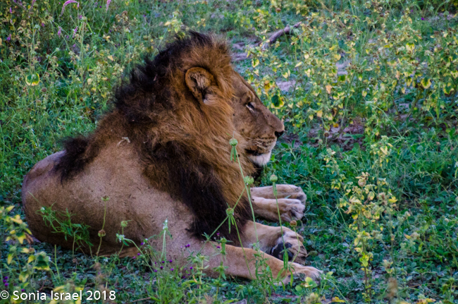 It was about 5:00 when we got there and Goodman announced that the lions would wake up at 5:30. Well, 5:30 came and went. One lion would lift us his head, look around, and go back to sleep. The other barely moved. 6:00 came and went. Their sleep inertia was strong. But finally, at about 6:15ish, they finally started to wake up. One sat up, yawned, began licking himself and then strolled out from under the tree to relieve himself. The other slowly followed suit. We moved the Land Rover so we could keep watching them walk around, lie down again and go back to sleep. Get up and move a bit more. They were walking in a field of flowers as if in a painting.