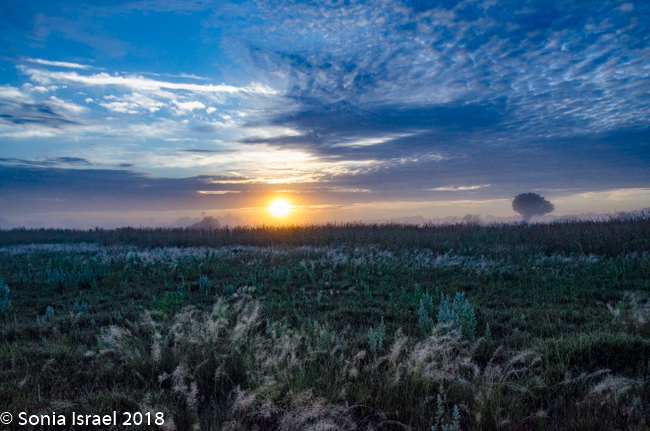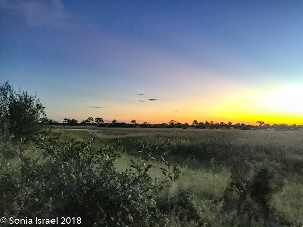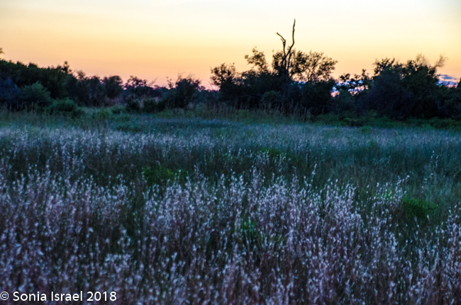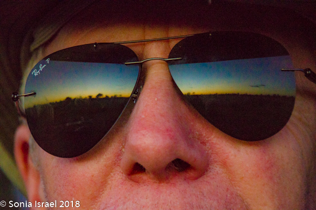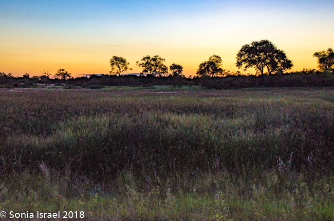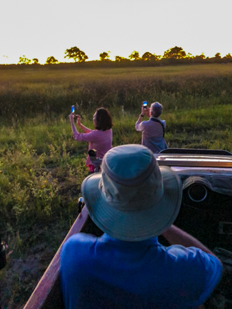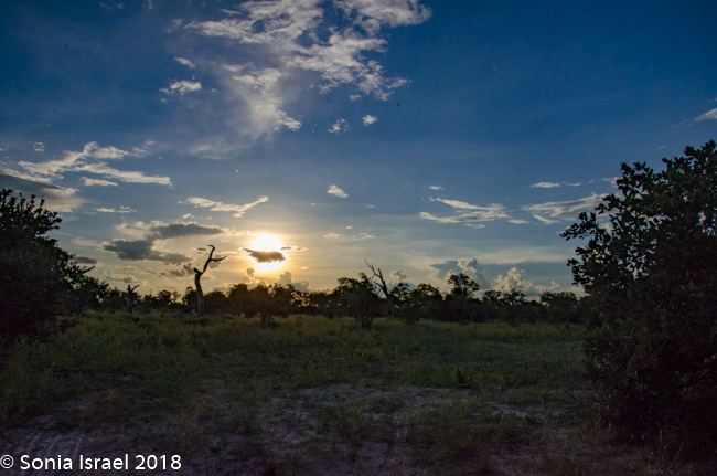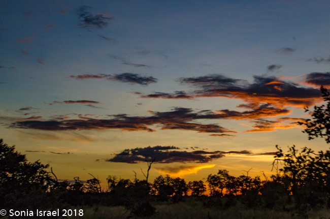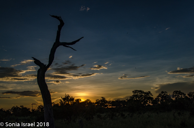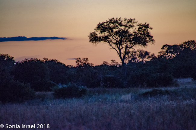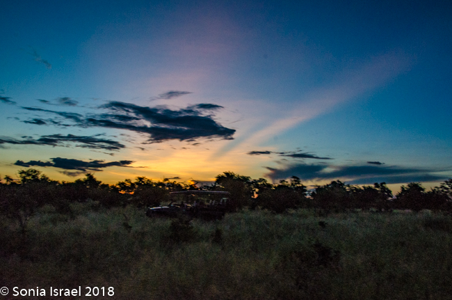 We drove a short distance and then stopped at an open field watching the sun set. Goodman gave us permission to leave the car and Phyllis and I scampered out. What an opportunity to shoot the sunset from land rather than from the Land Rover. We stood quietly, not because there were animals we didn’t want to disturb, but because there was a stillness in the air that we didn’t want to disturb.