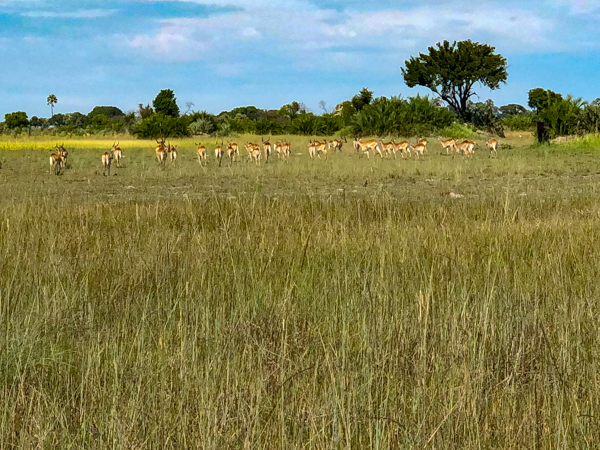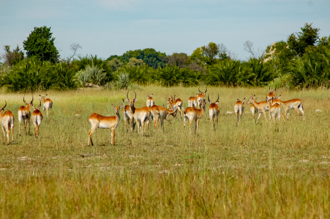 The Red Lechwe is one of the medium-sized antelopes. One distinguishing feature is that their hindquarters are noticeable higher than their forequarters. They are reddish brown on the upper parts, thus the name. But on their under sides they are white with white patches around their eyes. There is yet more color, as the front of the forelegs are black. They are only found in the Okavango Delta and Linyanti swamps in Botswana, both of which we were visiting, and in Namibia, our next destination. And we saw hundreds of them.