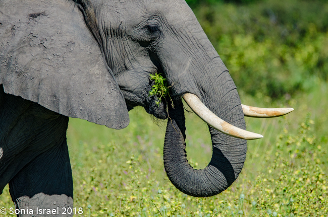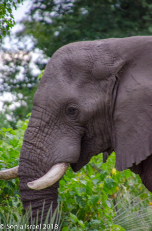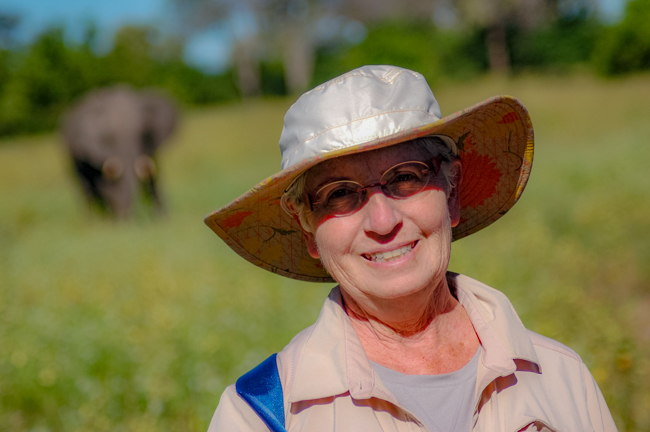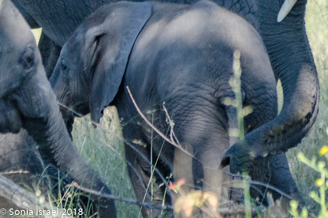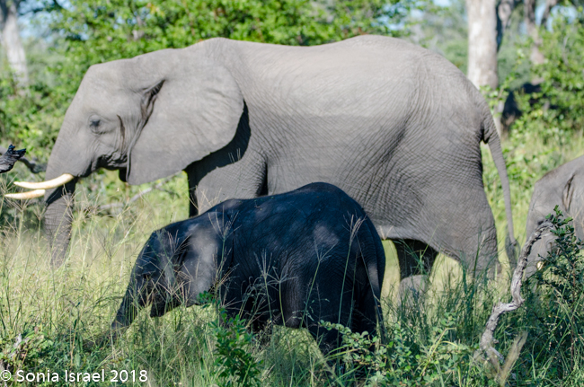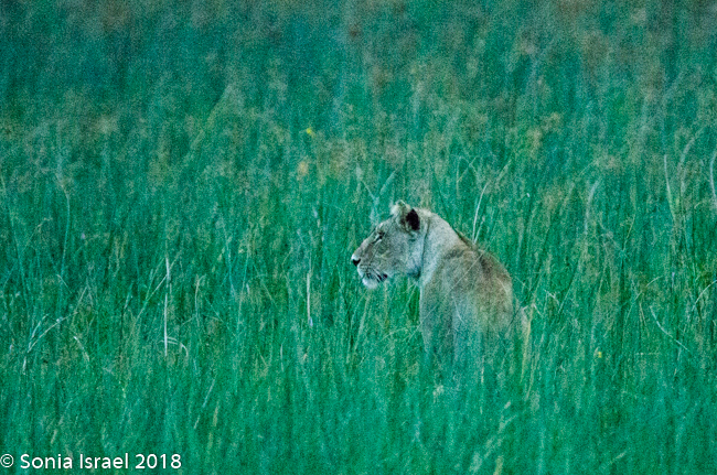 So we were speeding along and suddenly Kitso stopped and pointed straight ahead. And there she was. Our lioness low in the tall grass, so that we could hardly see her. She was stalking something, but we were not sure what. Then up ahead we saw a herd of elephants. Adults and two babies. The adults quickly surrounded the babies to protect them. The lioness stood up giving us a perfect view of her face. And as she moved around, Kitso moved the jeep so we could follow her. At one point she walked right by the side of the jeep. We kept very still and very quiet – except of