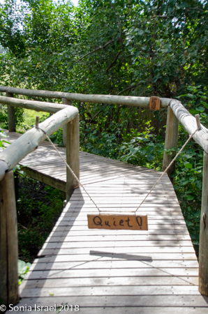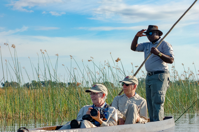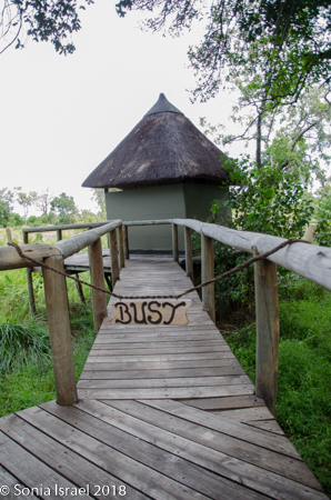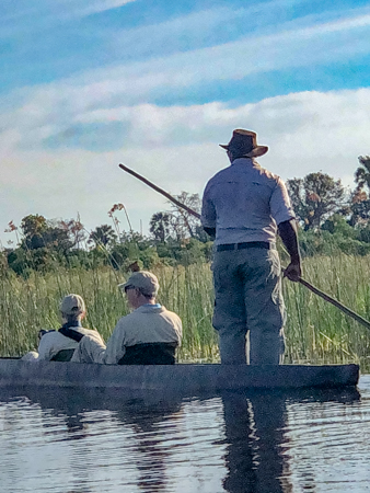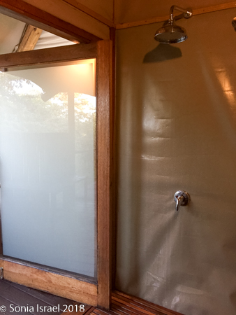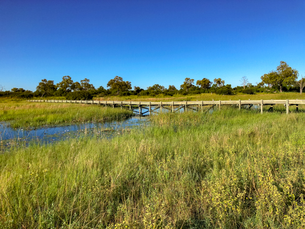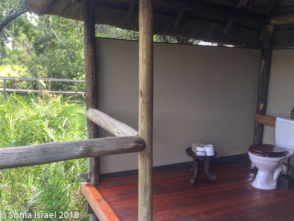 Meals were served in the dining area overlooking a permanently flowing channel. The bar/lounge area was also right there. Dinner was served communal style, that is, we all sat together at one long table. There was a small swimming pool (they call it a plunge pool) but, although we did have bathing suits with us, we never went swimming. There was a small gift shop and two bathrooms down the path from the dining/lounge area. The bathrooms had three walls, with the last side open to the Delta. No one could see in, but you could look out at the beautiful view. And to let people know the bathroom was occupied, there was a wooden BUSY sign that you hung across the bridge leading to the bathroom. If you didn’t want to be disturbed in your tent, there was a similar QUIET sign that you hung across the bridge leading to the tent.