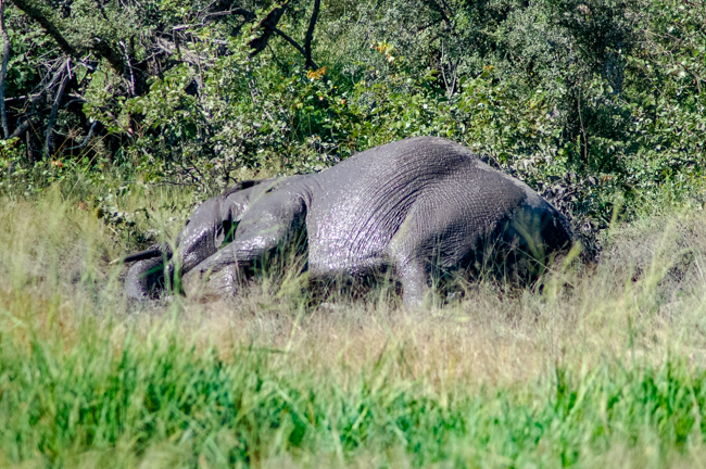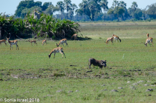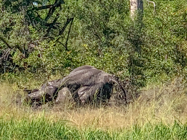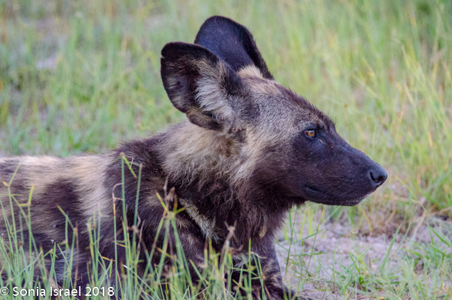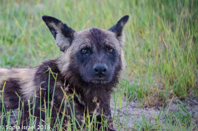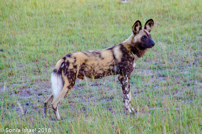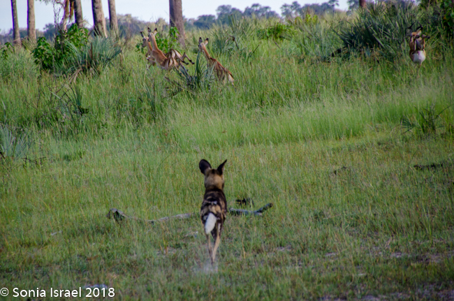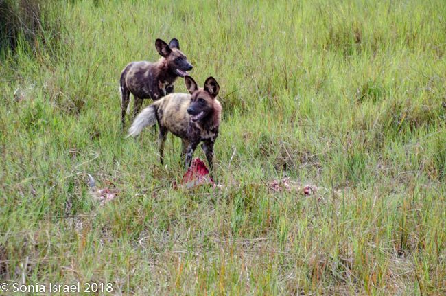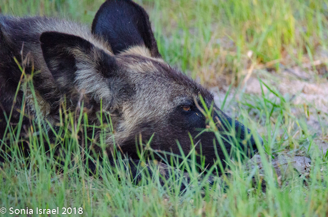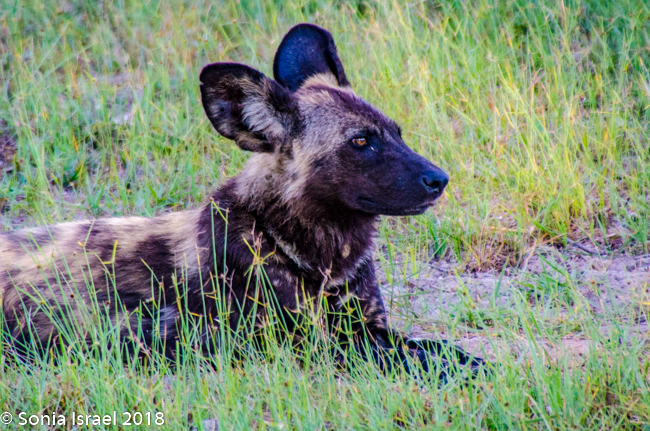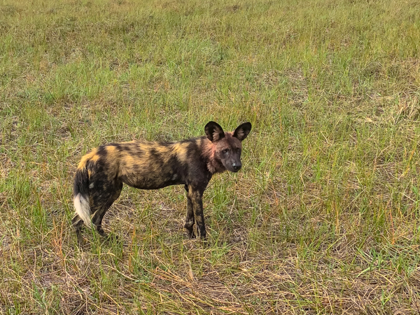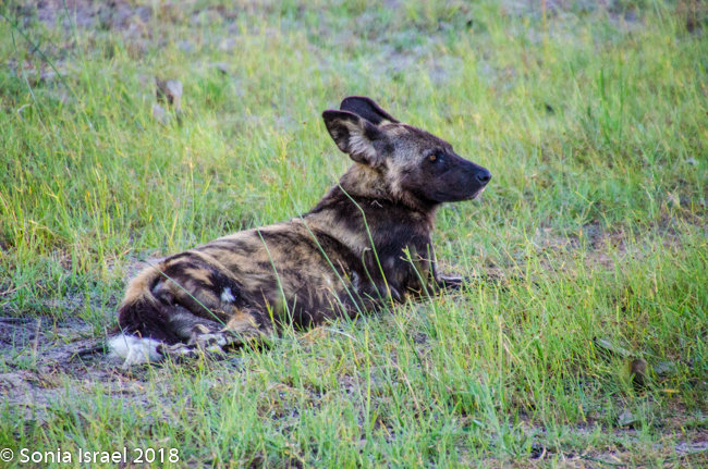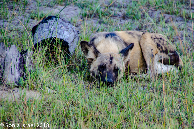 And then Kitso saw something on the other side. More Red Lechwe. But even beyond them there was a pack of wild dogs, also called painted dogs. He told us that these have been hard to spot but here was a whole brood of them, about 7, all lying around, sleeping. Every once in a while, one would lift his head, look around, and go back to sleep. Interestingly, although they were in a circle, they slept facing out, one in every direction so they could keep watch.