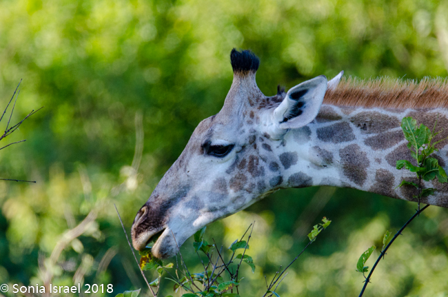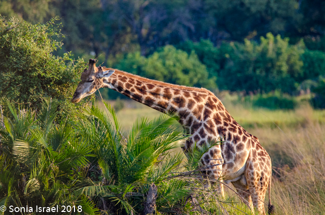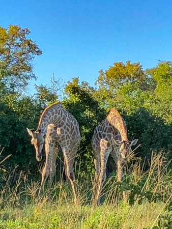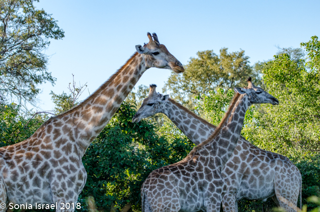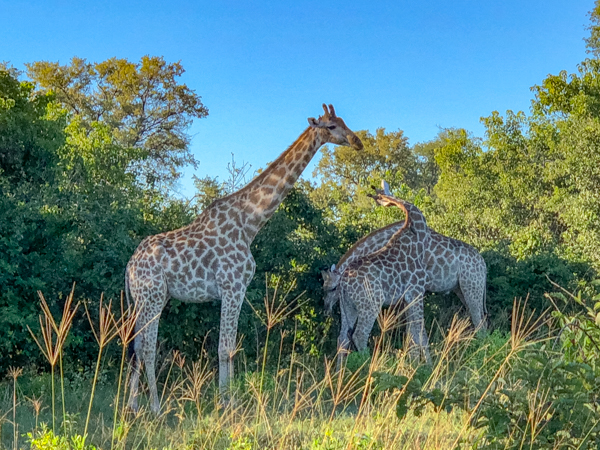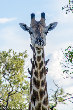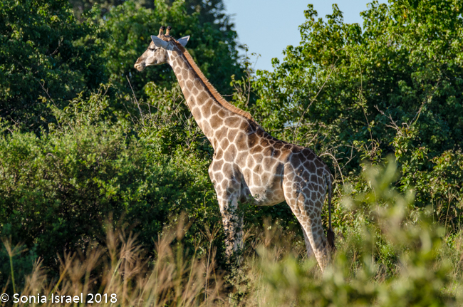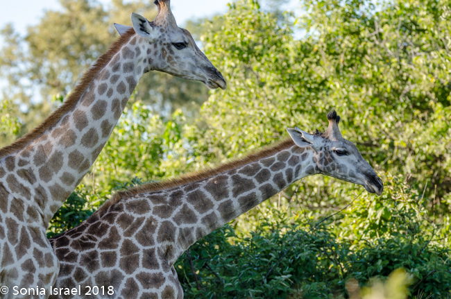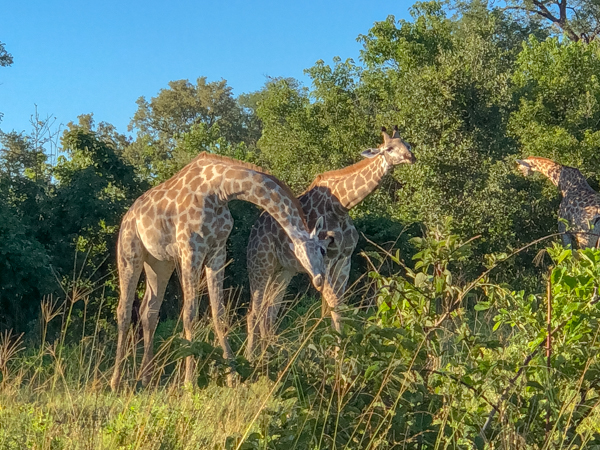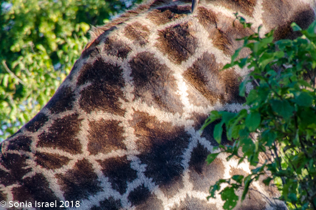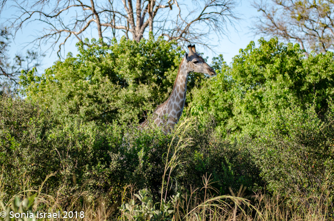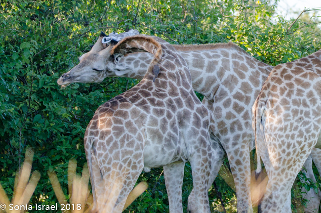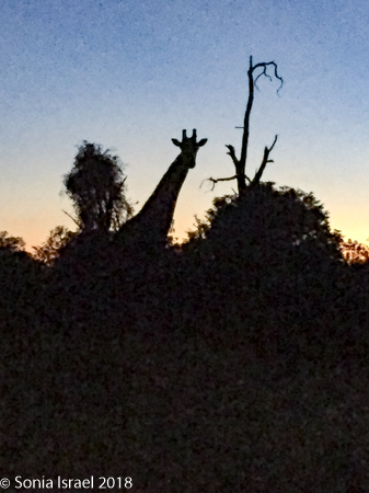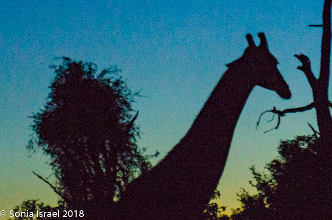 On one of our morning drives, we saw a giraffe, then two, then three, then four. This happens as you see one from the road, you start driving across the brush and suddenly more come into sight. Often they are peeking out from the trees. You see a group of trees and bushes, and suddenly you realize one of those is actually a giraffe. You wouldn’t expect them to be camouflaged with their brown and yellow pattern, but somehow they do blend into the trees. And at night, when they are silhouetted against the dark sky, they look like walking trees.