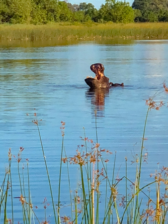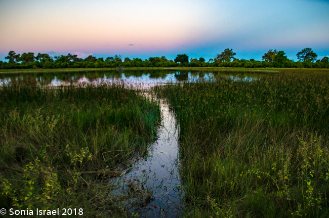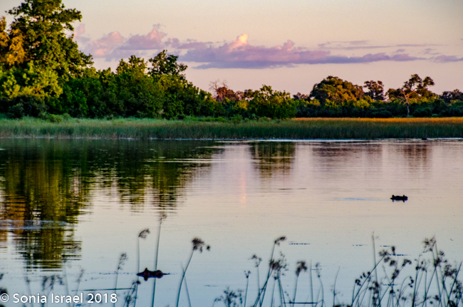 We saw hippos throughout the two days in the Savuti area. Each time we passed a pond, it had hippos in it. One rather large pond (small lake?) had lots of hippos (a group of hippos is called a pod, similar to whales, who are their relatives). We stayed there a long time watching them. It was dusk and we were hoping they would make their way down the hippo channels. We could see the paths (channels) leading out of the water, one for each of the hippos. This is where they walk in the evening when they come out of the water. The sun was slowly setting, reflecting the trees into the water. We waited and waited. We saw them porpoise! I never knew they do that. We saw them breach and then splash down, just like the humpback whale! I never knew they did that either. This confirmed that they are indeed related to whales. We heard them grunt. We heard them growl (that’s what they do when they are not happy; good time to stay away). We heard them trumpet. We saw them yawn (I hope that was a yawn; those were some big teeth). But we never saw them come out of the water.