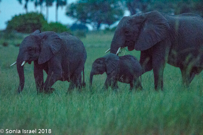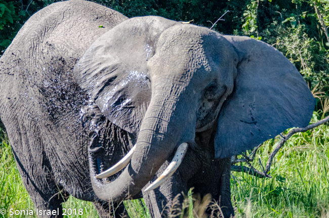 The next day we were driving around for about two hours stopping to watch different birds and bopping hippos. But then we saw a herd of about 30 or 40 elephants. There were babies of all different ages. The elephants basically ignored us and stood around eating. There was one with bad leg, limping around. There was one adolescent male with no tail and boy was he angry. The spot where his tail had been was red and raw suggesting it was a recent loss and that he must have been in pain. We stayed far away from him. And we discovered that elephants do indeed trumpet.