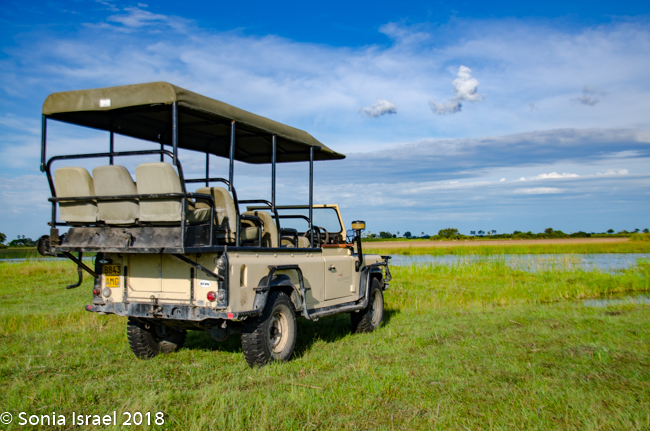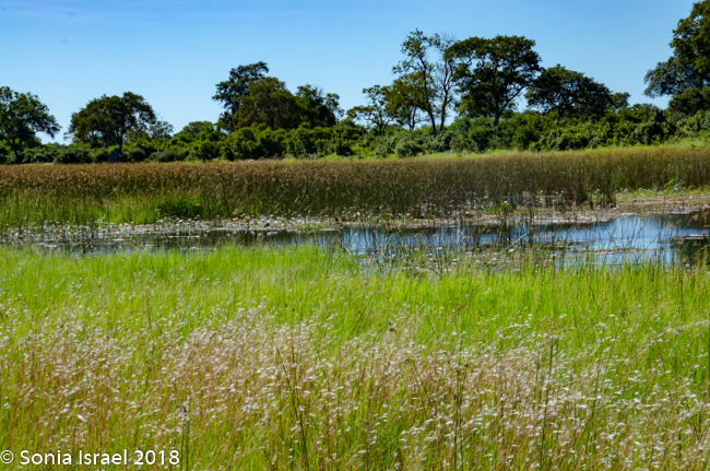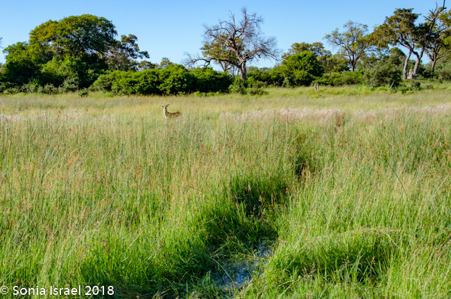 So we climbed into our Land Rover and headed off. We could tell right away that the landscape here was very different. There were groves of trees with small watering holes in between, instead of tall grass and bushes. We drove by an empty field, full of grass. Goodman took one look and pronounced that a lion must have recently been there. How did he know, we asked him. Because the field is usually full of red lechwe and now there were all gone. Plus he could smell lion (which he said smelled like corn). Ah, the smells of Africa.