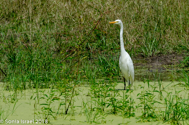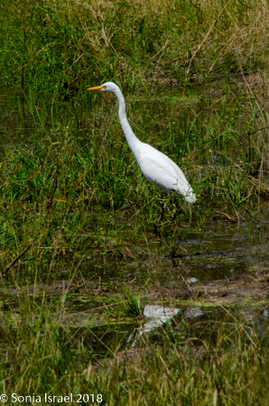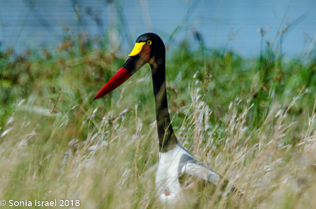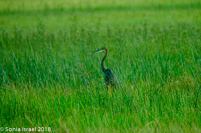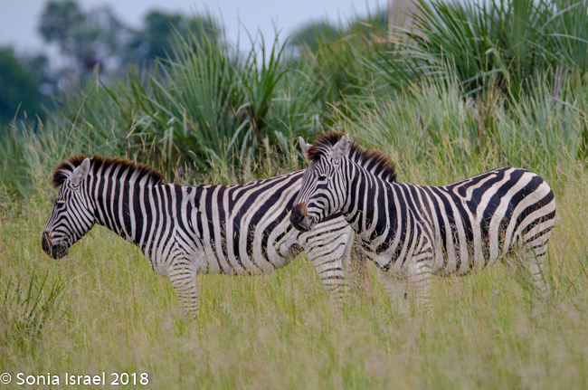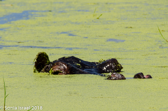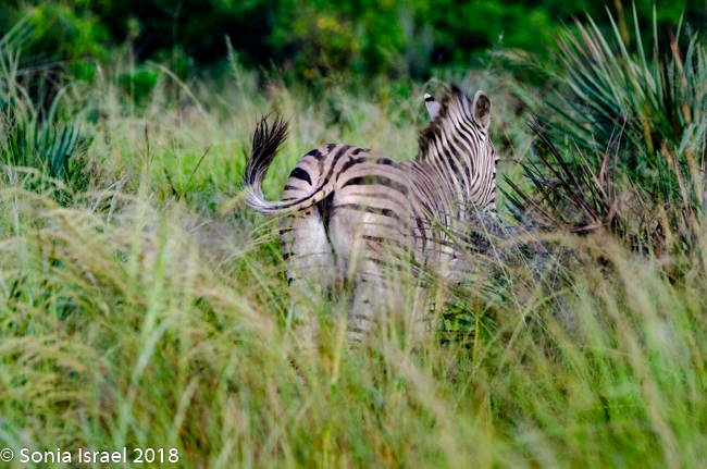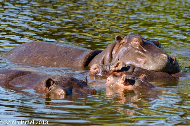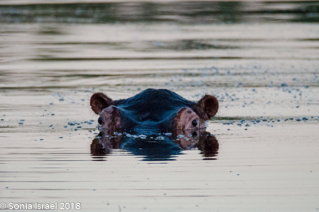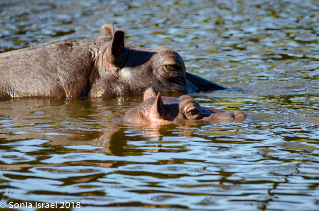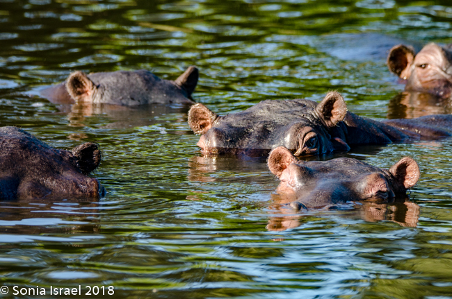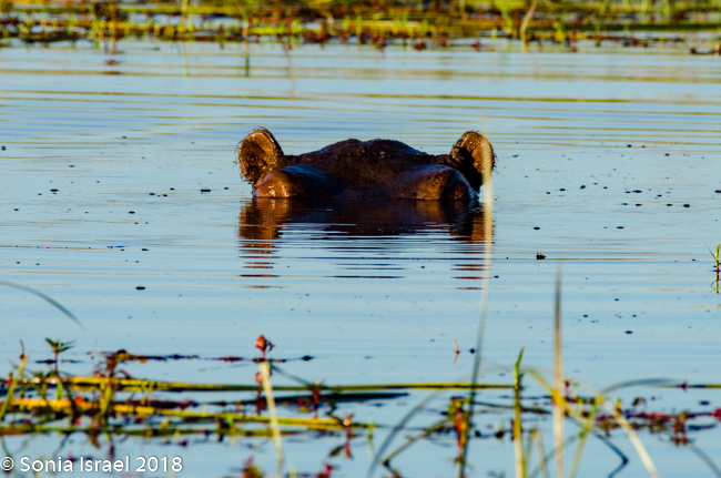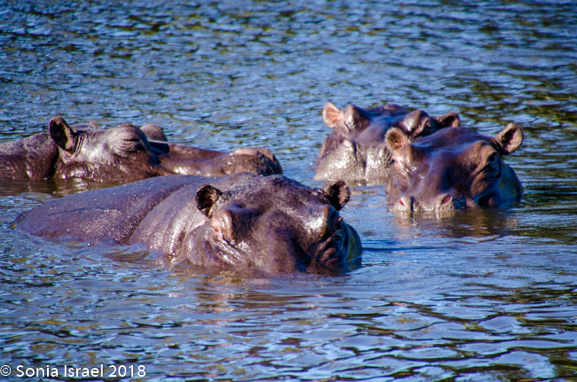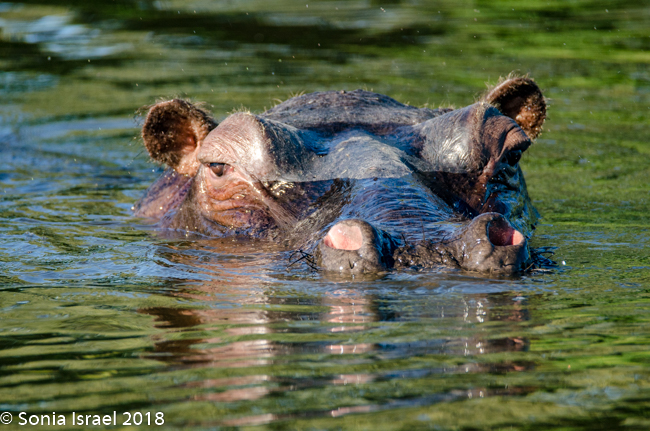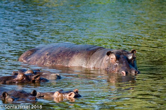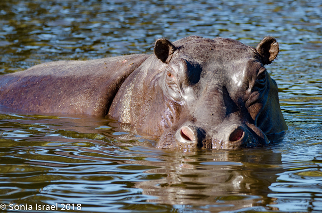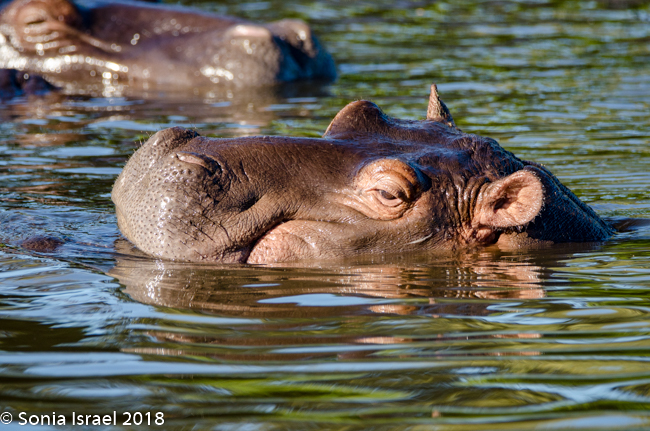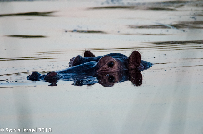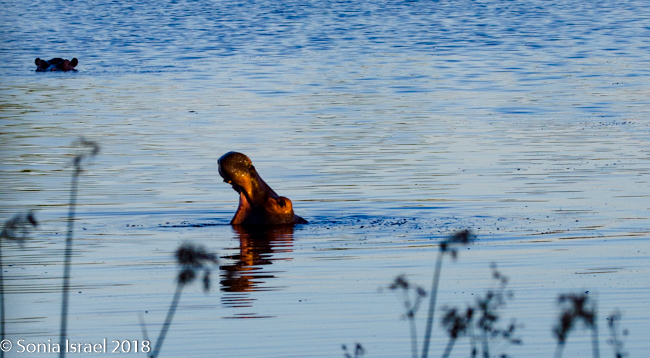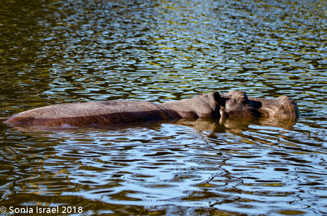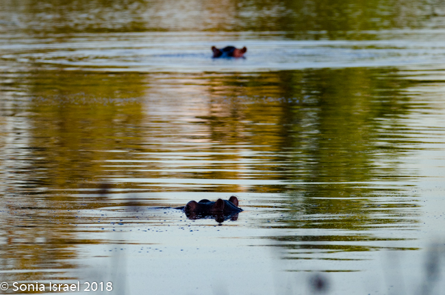 Our first search was for hippos and boy did we find them. At one water hole we saw two, then three, then four, then five or six hippos. They would slowly bob up from under the water, reminding me of the arcade game, Whack a Mole. There were at least two babies and two very large mothers. They would bop up and down, sometimes together, sometimes randomly. We could see their nostrils, their eyes and their hairy ears. And sometimes much of their bodies. Hippos are large animals! An adult can weigh between 1.5-4 tons and they can grow up to 14 feet long. The ancient Greeks called them “river horses” as they love being in the water, spending up to 16 hours a day just lumbering along the bottom of the rivers and lakes, often with only their eyes and nostrils bopping above the surface. This is how they keep cool. That’s mostly what we got to see. I really wanted to see one fully out of the water, but never did.