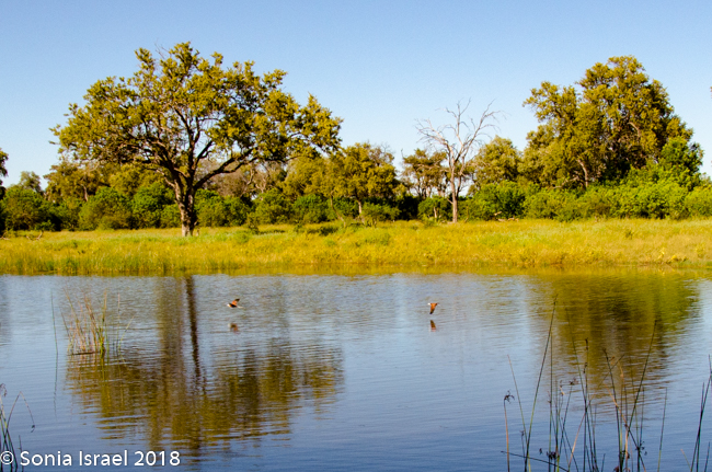 Xigera Camp (pronounced Keejera) lies on Paradise Island within a remote area of the Moremi Game Reserve. It is surrounded by deep channels and lush vegetation which made it a perfect place to look for animals and birds. The Xigera Concession is 23 square miles. It is full of papyrus swamps. And the animals here are primarily sitatunga antelope, red lechwe, spotted-necked otters, vervet monkeys, impala, leopards, spotted hyena, and the occasional lion. And the birds! Owls, African skimmer, brown firefinch, greater swamp warbler, wattled crane, African pygmy goose, Luapula cisticola and lesser jacana as well as kingfishers. How many of these would we get to see? We were given a checklist so we could keep track.