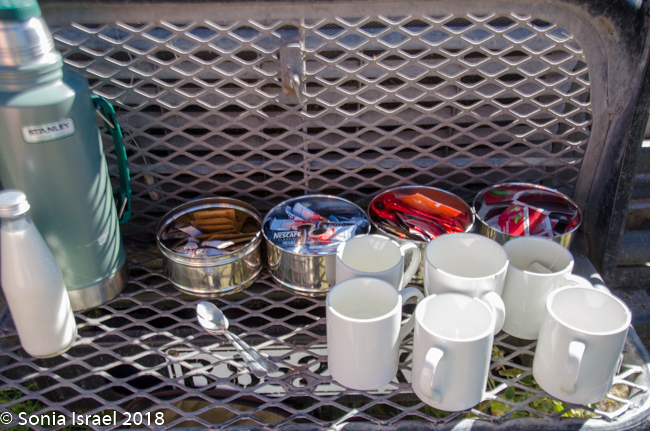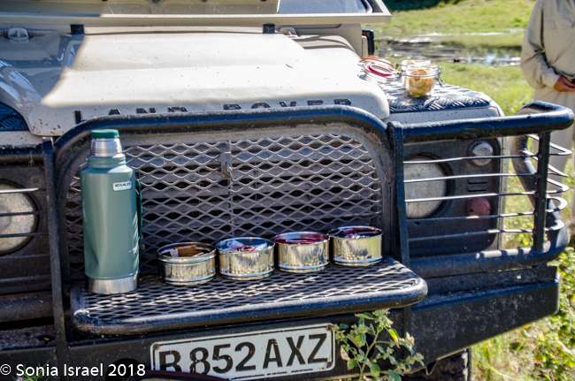 Our wake-up call, that is, someone knocking on our door, came at 530. The sun was just getting ready to rise and the sky was a stripe of red. By 6:00 we were in the dining hall for a continental breakfast, and by 630 we were back in our Land Rover on the road.