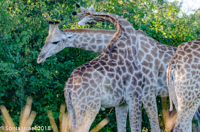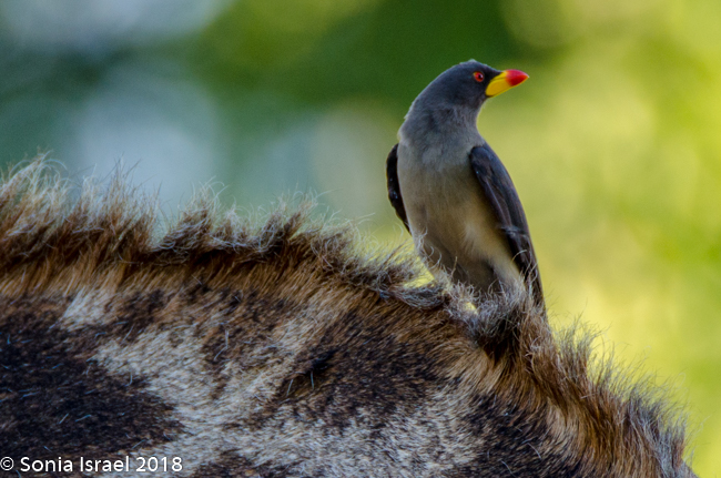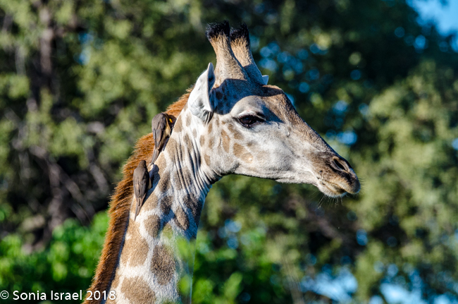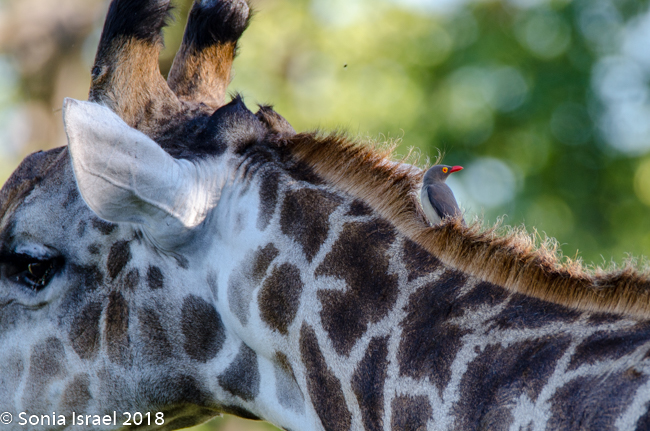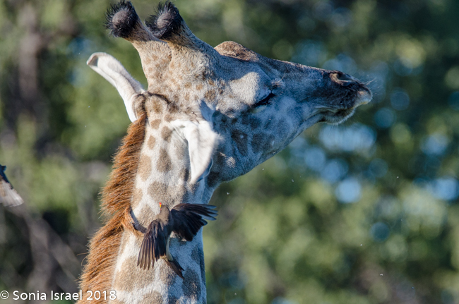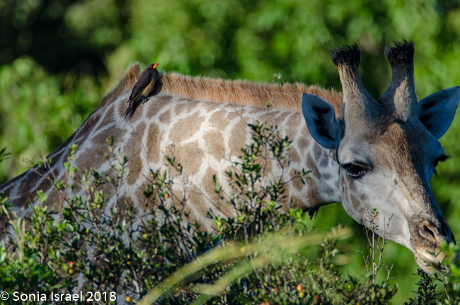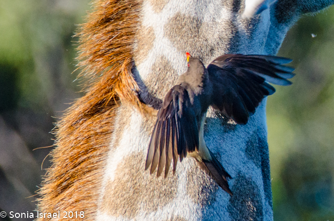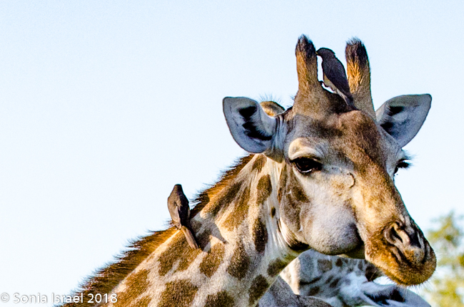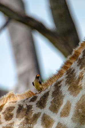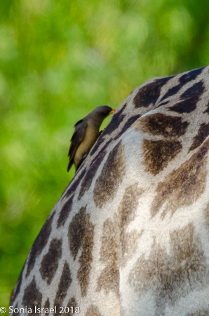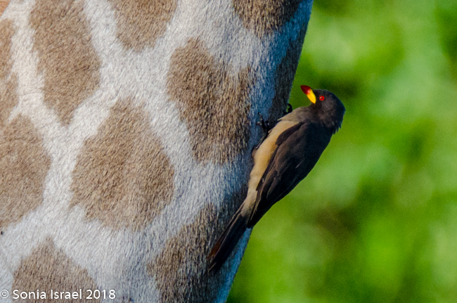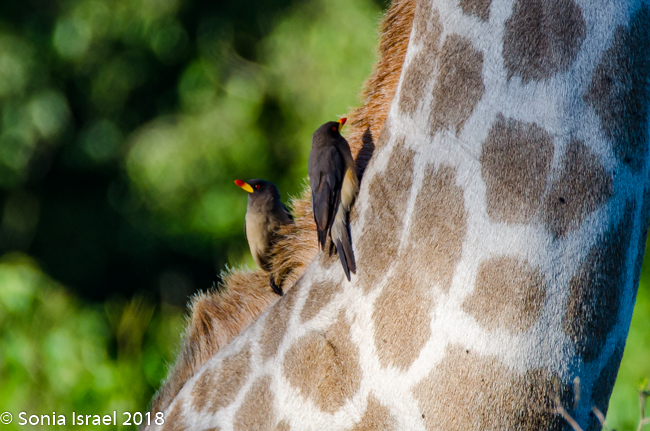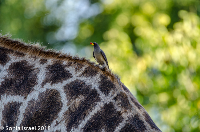 Some of the giraffes had little birds picking and eating the insects and parasites off their heads, neck and backs. These are the yellow-billed oxpeckers, and sometimes the red-billed oxpeckers, which hang out on giraffes, as well as on water buffalo. They have a beneficial relationship with the hosts providing food for the birds and the birds giving the giraffe a cleaner, healthier skin and the bird getting food. Sometimes we would see a lone oxpecker and other times they would be lined up and down the giraffe’s neck, feasting.