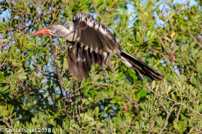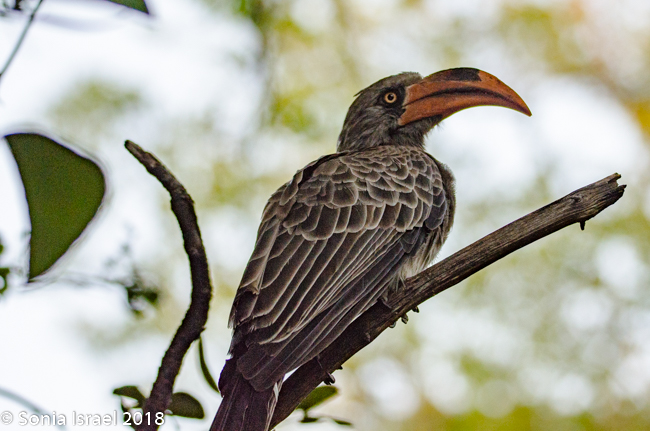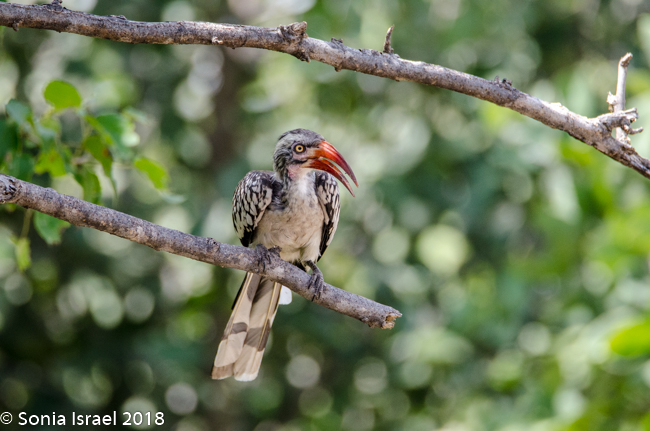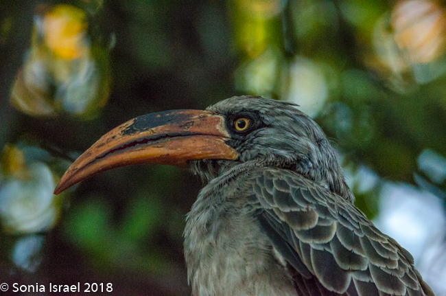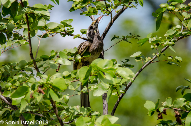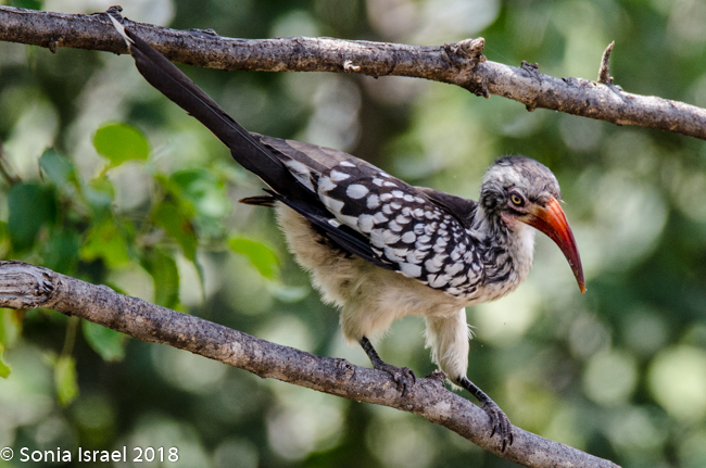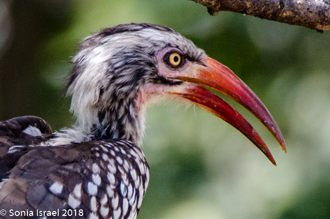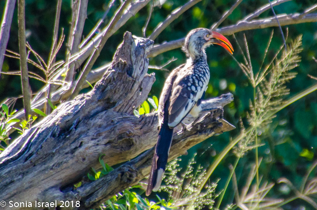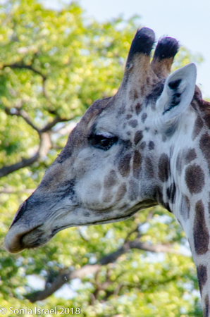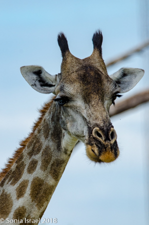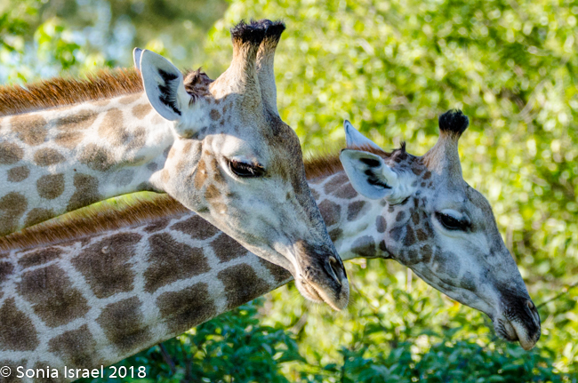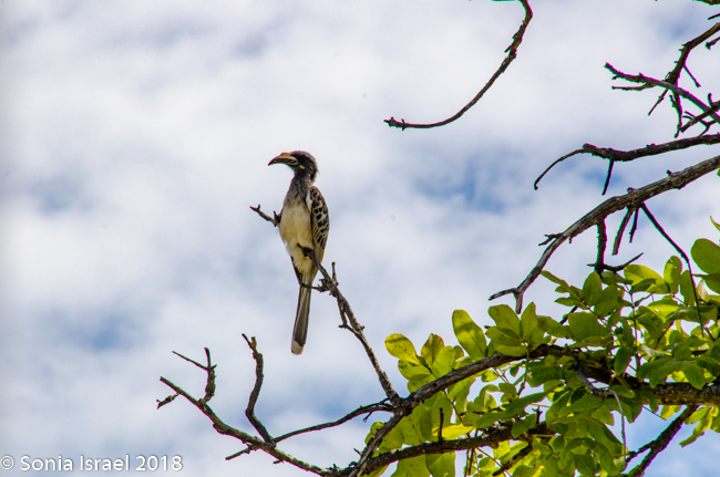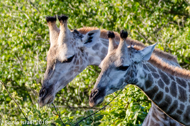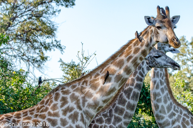 Some of the giraffes had little birds picking and eating the insects and parasites off their heads, neck and backs. These are the yellow-billed oxpeckers, and sometimes the red-billed oxpeckers, which hang out on giraffes, as well as on water buffalo. They have a beneficial relationship with the hosts providing food for the birds and the birds giving the giraffe a cleaner, healthier skin and the bird getting food. Sometimes we would see a lone oxpecker and other times they would be lined up and down the giraffe’s neck, feasting.