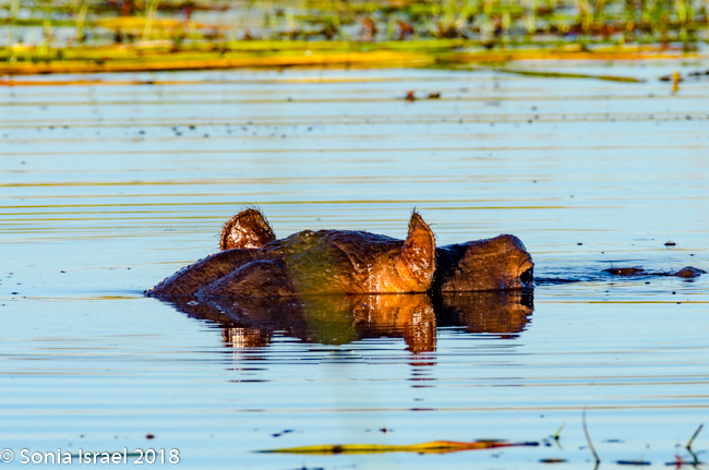 Our first search was for hippos and boy did we find them. At one water hole we saw two, then three, then four, then five or six hippos. They would slowly bob up from under the water, reminding me of the arcade game, Whack a Mole. There were at least two babies and two very large mothers. They would bop up and down, sometimes together, sometimes randomly. We could see their nostrils, their eyes and their hairy ears. And sometimes much of their bodies. Hippos are large animals!  An adult can weigh between 1.5-4 tons and they can grow up to 14 feet long. The ancient Greeks called them “river horses” as they love being in the water, spending up to 16 hours a day just lumbering along the bottom of the rivers and lakes, often with only their eyes and nostrils bopping above the surface. This is how they keep cool. That’s mostly what we got to see.  I really wanted to see one fully out of the water, but never did.