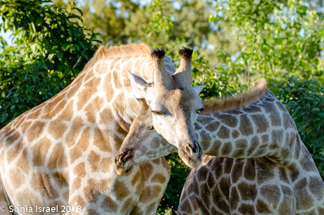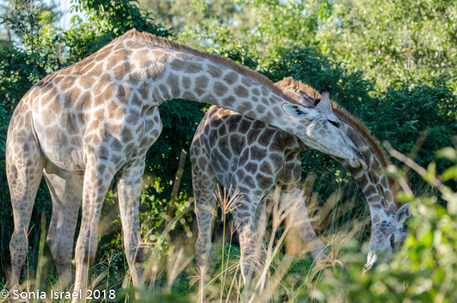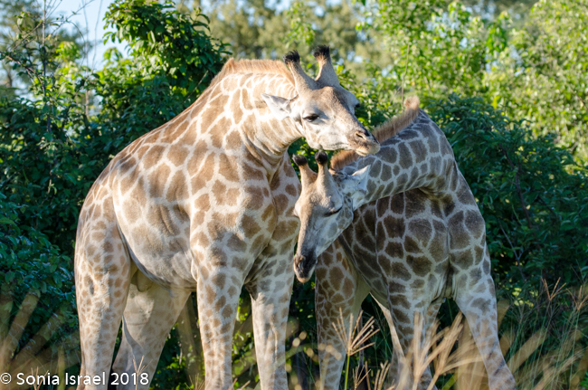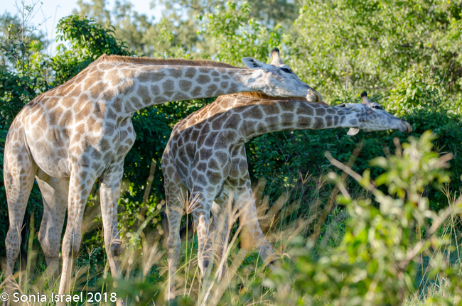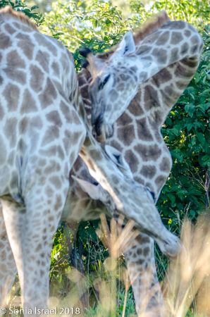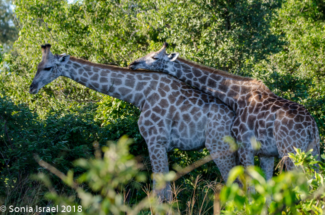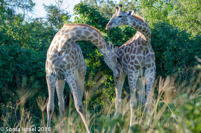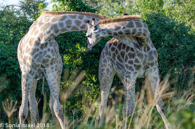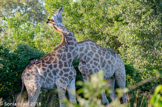 This is not what you think. We saw the two young males practice fighting by wrapping their necks around each other. Giraffes fight with their necks as that is the most powerful and maneuverable weapon they have. They swing their necks as fast as possible, sort of like the swinging of a medieval mace. This is called necking, and in the world of giraffes is the most violent and unpleasant experience possible. Often it is two bulls fighting each other over a female giraffe. So, what else is new?