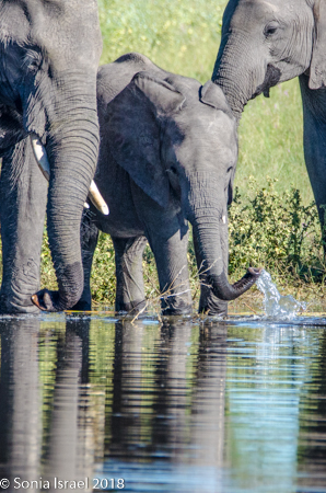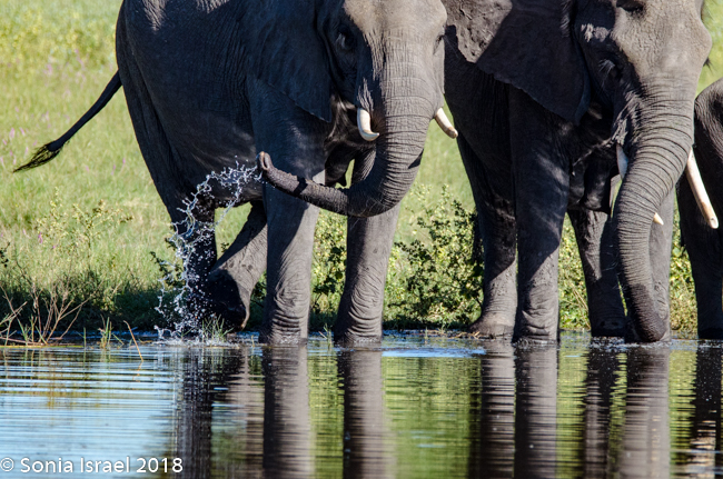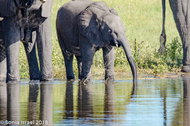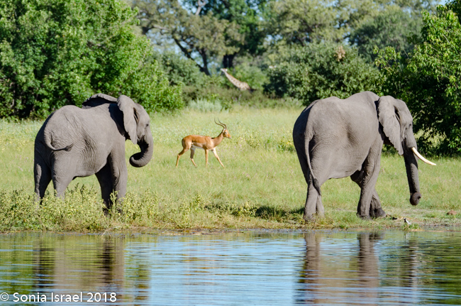 It was already a wonderfully successful morning. Hippos. Giraffes. But there was more. We passed another large water hole that was surrounding in part with elephants drinking. There were several adults and one baby, all dipping their trunks into the water, cupping the end to fill up and then curling it up to their mouths to drink. Their legs and bodies reflected in the water. Behind them, there were giraffes eating leaves off the tall trees. And then an impala ran through, scaring the elephants back from the water.