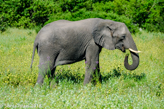 tay away from the elephant. The elephant will go and smell the vulva of the females looking for one to mate with. Their hind legs are wet with urine as they urinate on themselves on purpose for the strong smell. This lone male must not have found any females in heat as he eventually wandered off. The other elephants kept eating grass and flowers and we just enjoyed the sight.