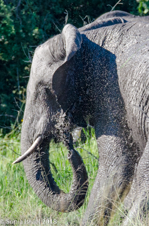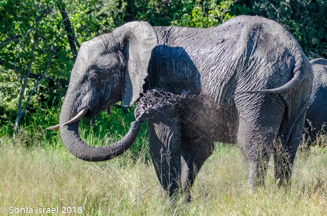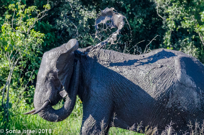 We watched them walk away, in a line, one following the other. And then we realized they were heading for a mud hole. Goodman repositioned the Land Rover and we sat for a while watching the elephants take turns in the mud, throwing it on themselves and rolling around in it. They were sure having fun. But mostly they do it to keep cool. Then they would run against a termite hill to get rid of their parasites.