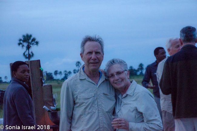 That evening, since it was Monday, the staff performed a show for us with traditional African music, food and dancing, all around a campfire. Seems they do this at each camp every Monday night. While we watched they passed around  small bites of African corn soup and other delicacies. They each then took the hand of a guest, danced around the fire with us a few times and then danced us to a long table set for dinner. It was all lovely, but so dark that we could hardly see them.
